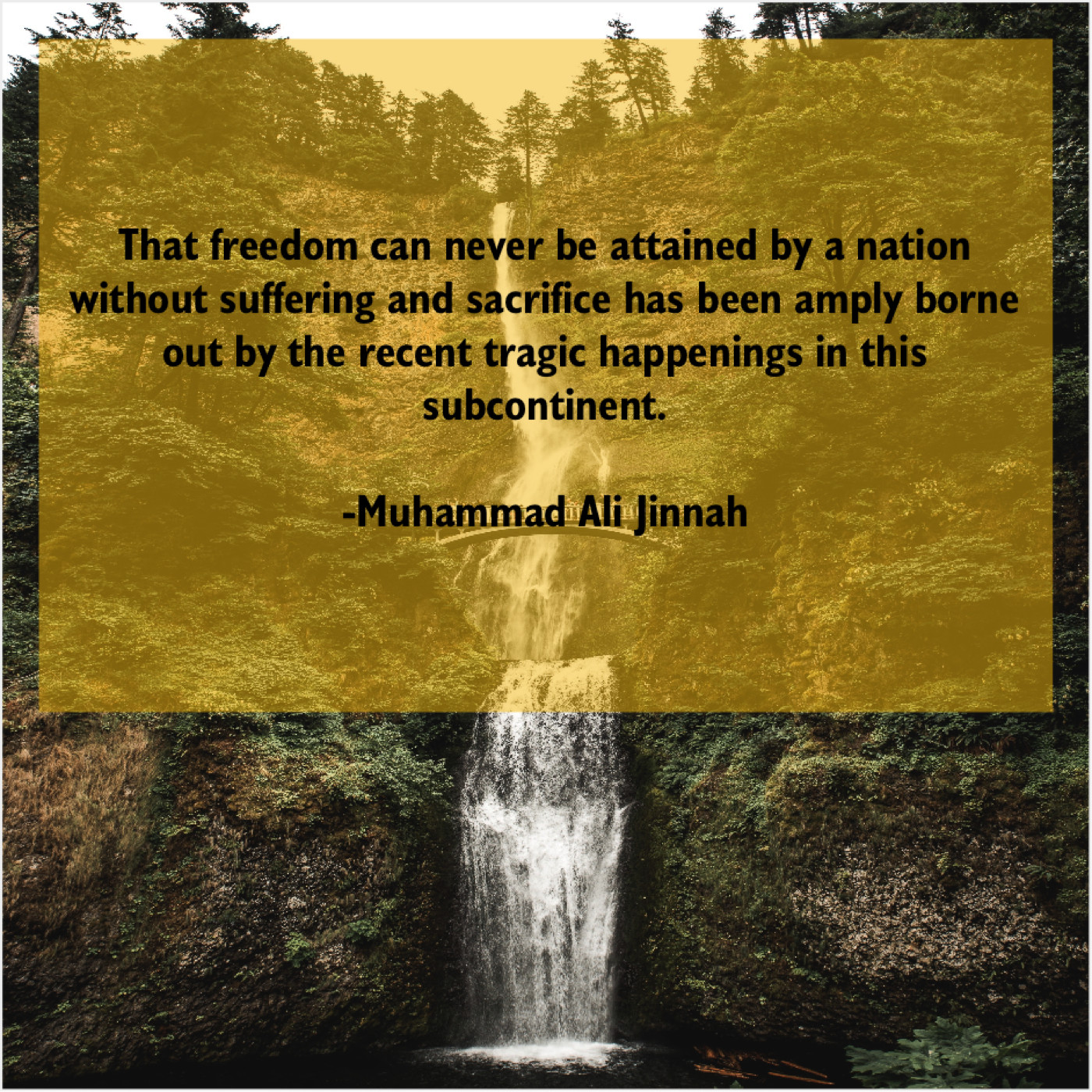 Muhammad Ali Jinnah Muhammad Ali Jinnah – That freedom can never be… August 22, 2019 admin “That freedom can never be attained by a nation without suffering and sacrifice has been amply borne out by the recent tragic happenings in this subcontinent.”-Muhammad Ali Jinnah