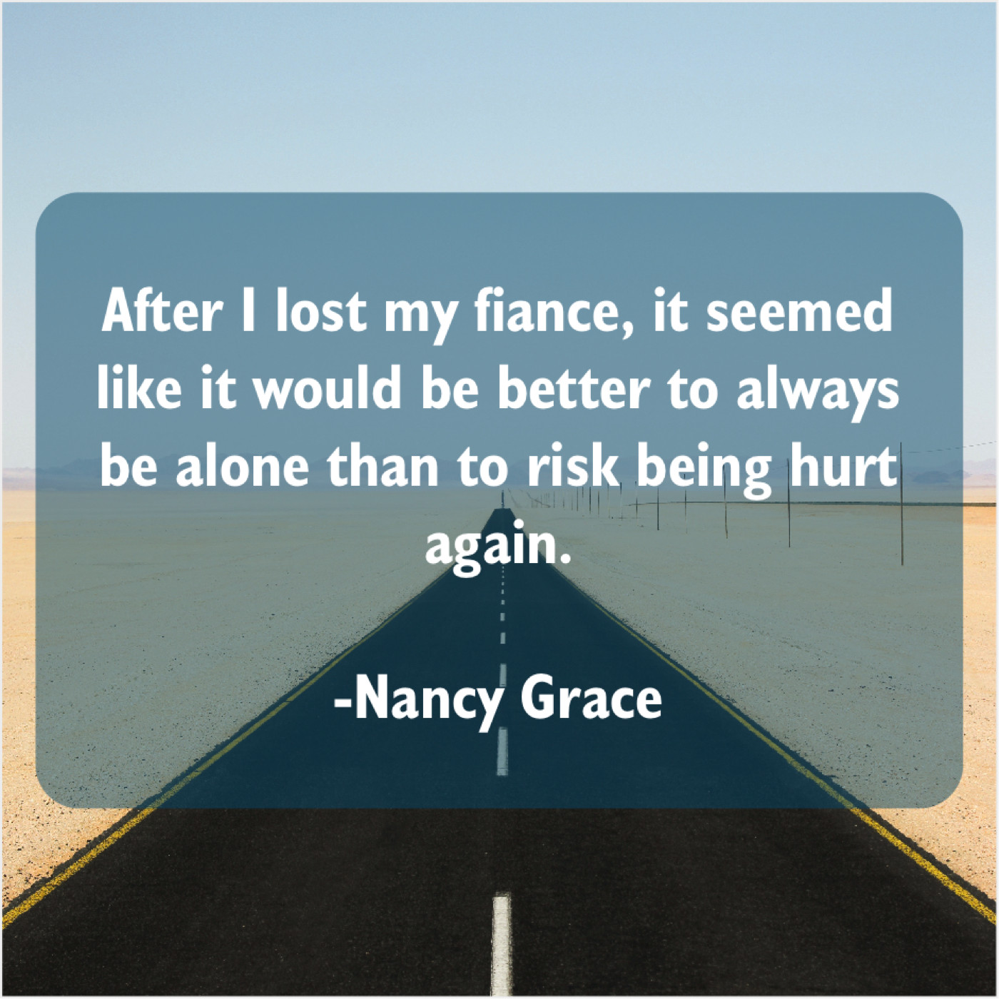 Nancy Grace Nancy Grace – After I lost my fiance… June 24, 2019 admin “After I lost my fiance, it seemed like it would be better to always be alone than to risk being hurt again.”-Nancy Grace