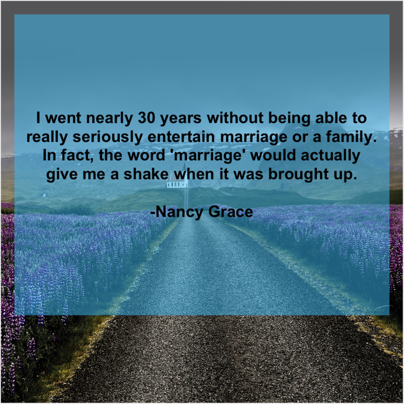 Nancy Grace Nancy Grace – I went nearly 30 years… January 11, 2019 admin “I went nearly 30 years without being able to really seriously entertain marriage or a family. In fact, the word ‘marriage’ would actually give me a shake when it was brought up.”-Nancy Grace