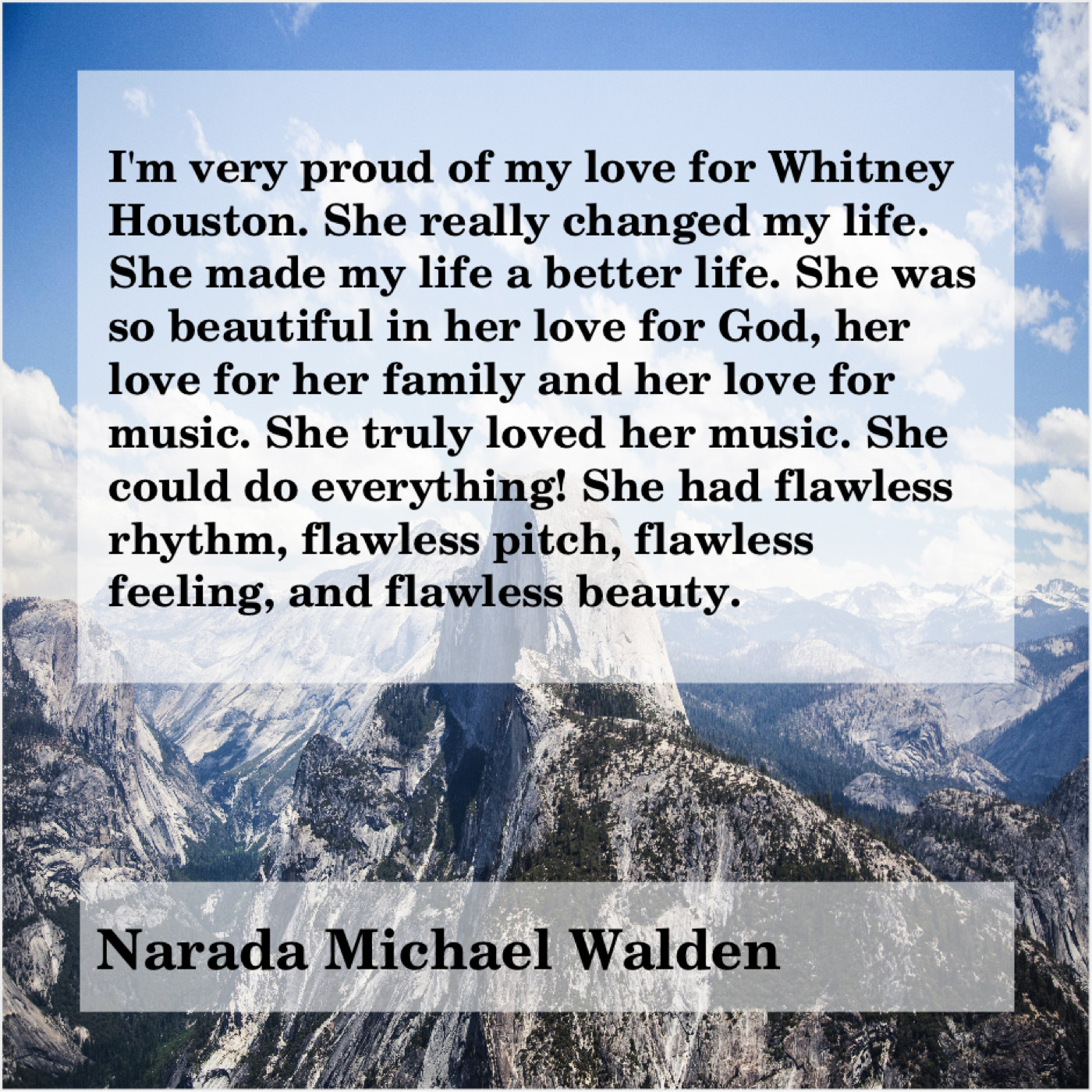 “I’m very proud of my love for Whitney Houston. She really changed my life. She made my life a better life. She was so beautiful in her love for God, her love for her family and her love for music. She truly loved her music. She could do everything! She had flawless rhythm, flawless pitch, flawless feeling, and flawless beauty.”