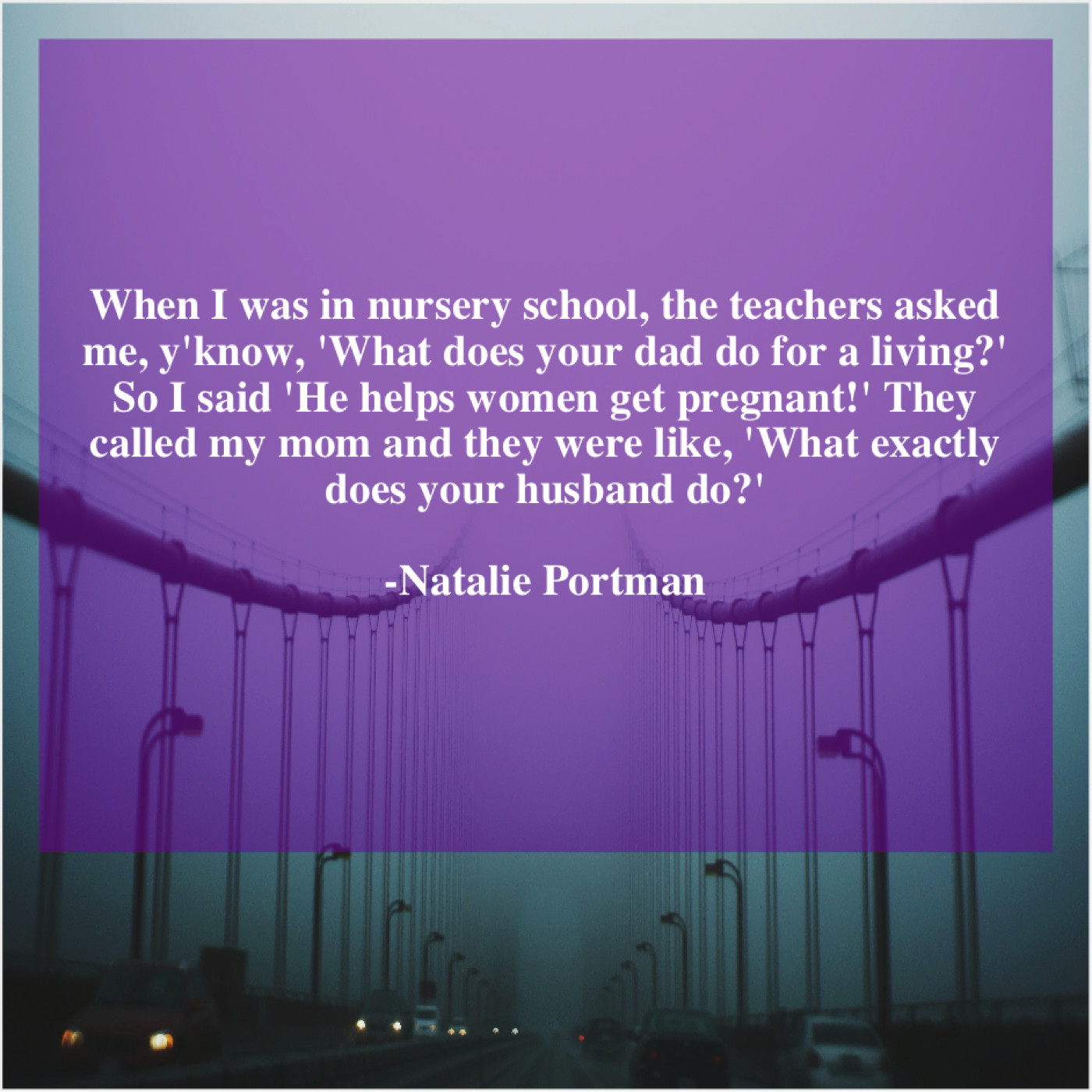 Natalie Portman Natalie Portman – When I was in nursery… April 8, 2019 admin “When I was in nursery school, the teachers asked me, y’know, ‘What does your dad do for a living?’ So I said ‘He helps women get pregnant!’ They called my mom and they were like, ‘What exactly does your husband do?'”-Natalie Portman