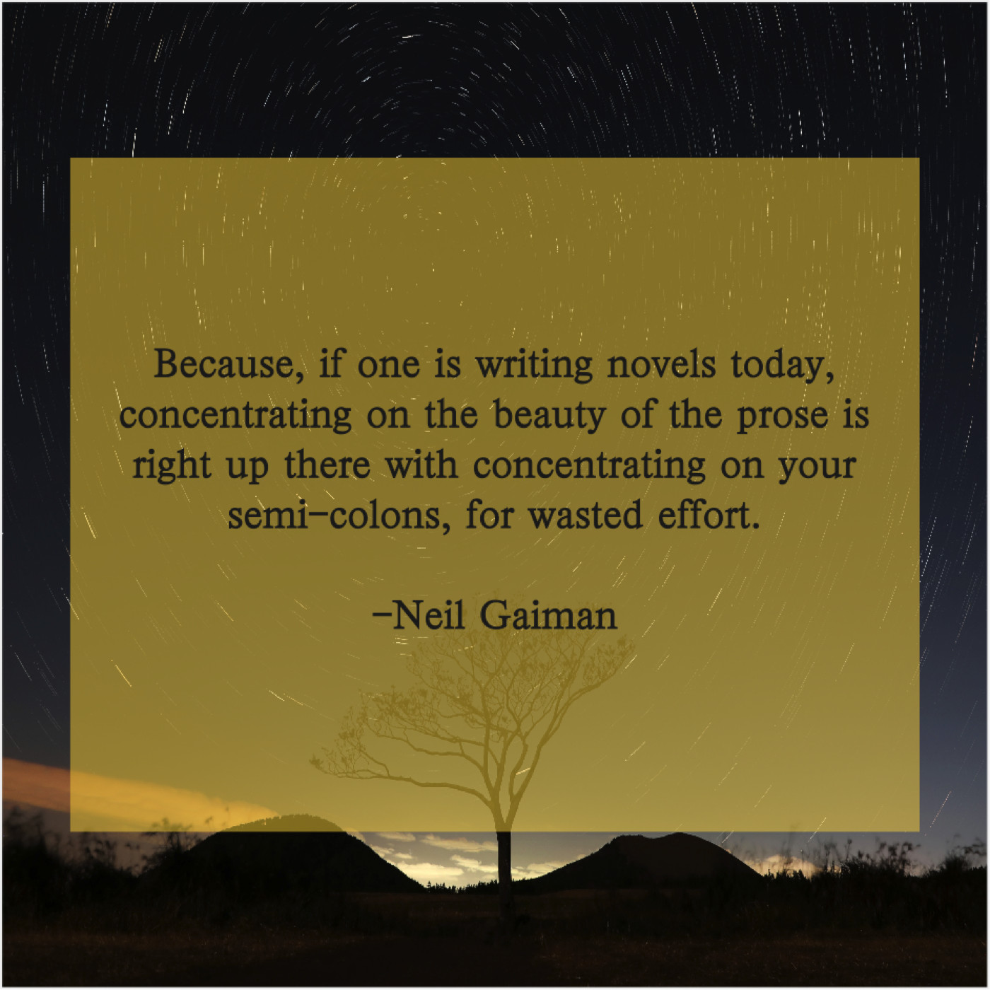 Neil Gaiman Neil Gaiman – Because, if one is writing… May 13, 2019 admin “Because, if one is writing novels today, concentrating on the beauty of the prose is right up there with concentrating on your semi-colons, for wasted effort.”-Neil Gaiman
