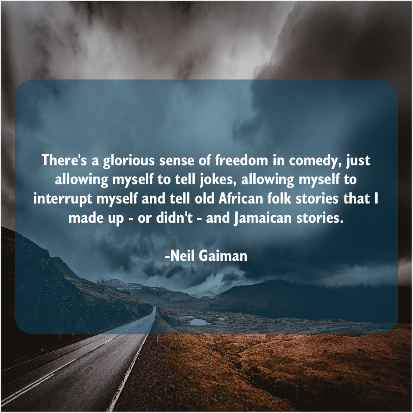 Neil Gaiman Neil Gaiman – There’s a glorious sense of… March 9, 2019 admin “There’s a glorious sense of freedom in comedy, just allowing myself to tell jokes, allowing myself to interrupt myself and tell old African folk stories that I made up – or didn’t – and Jamaican stories.”-Neil Gaiman