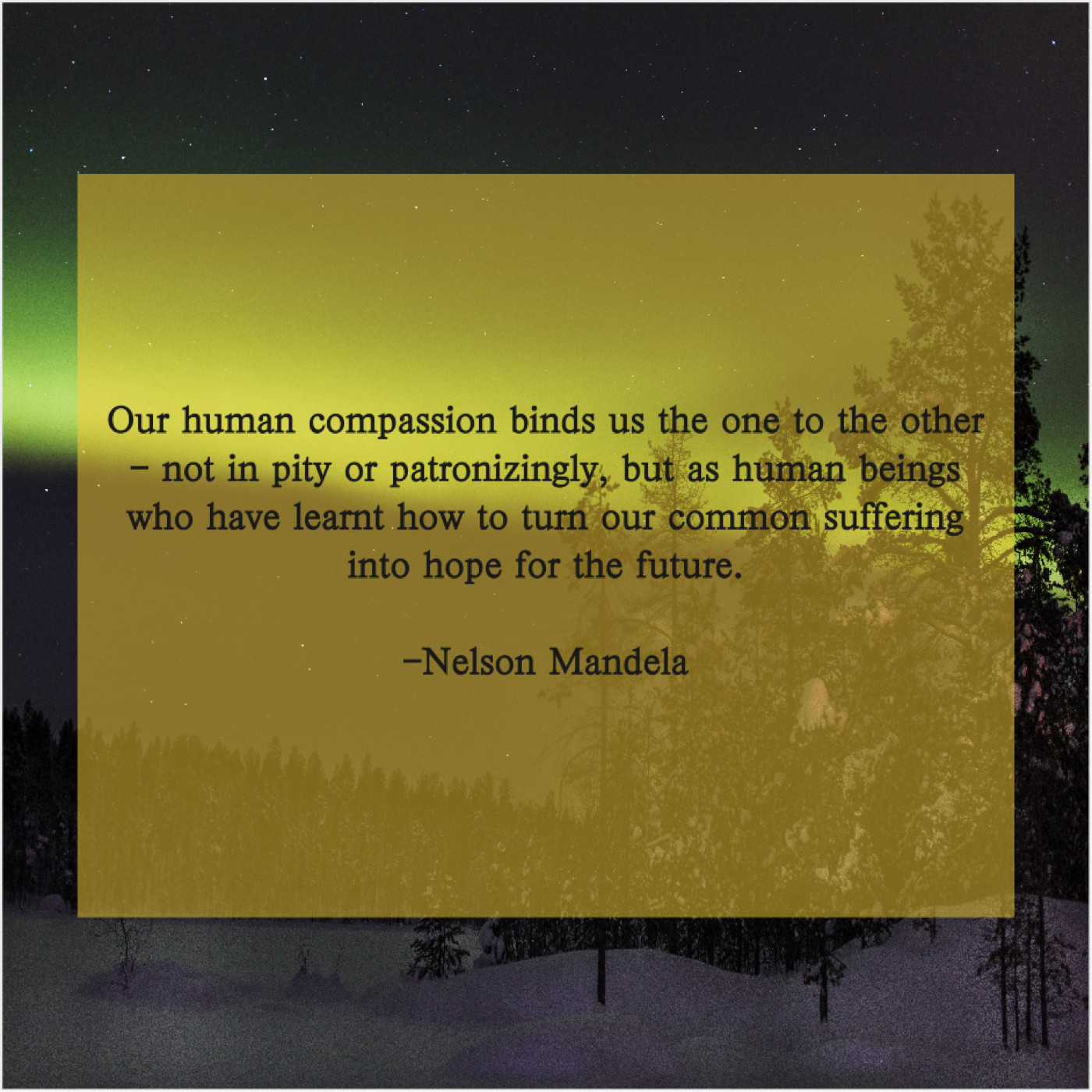 Nelson Mandela Nelson Mandela – Our human compassion binds us… July 10, 2019 admin “Our human compassion binds us the one to the other – not in pity or patronizingly, but as human beings who have learnt how to turn our common suffering into hope for the future.”-Nelson Mandela