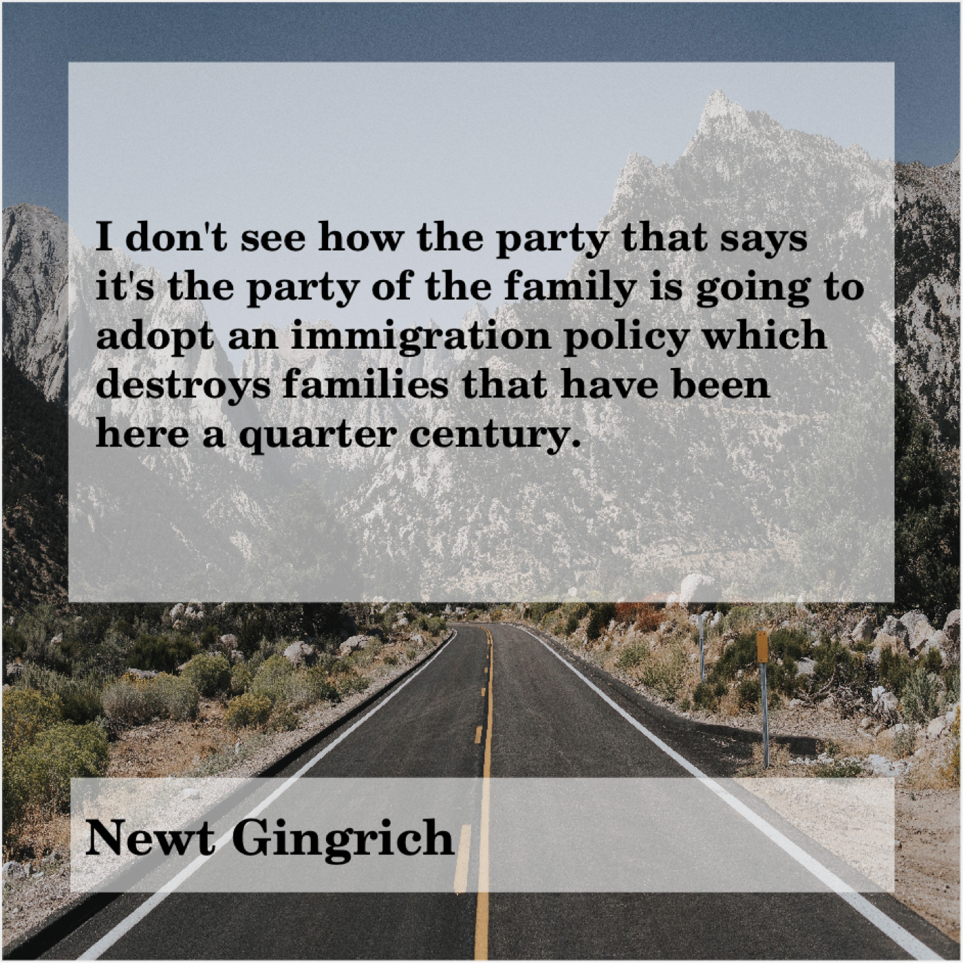 Newt Gingrich Newt Gingrich – I don’t see how the… January 2, 2019 admin “I don’t see how the party that says it’s the party of the family is going to adopt an immigration policy which destroys families that have been here a quarter century.”-Newt Gingrich