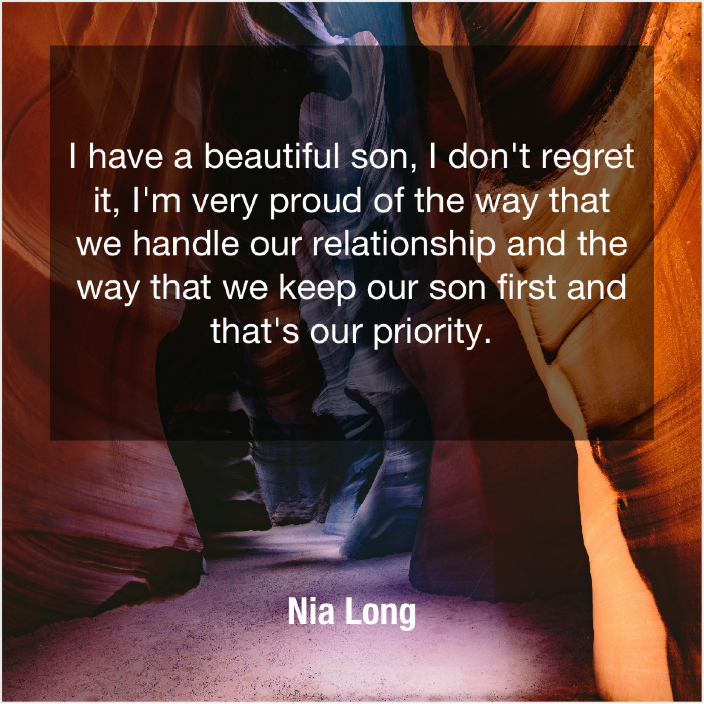 Nia Long Nia Long – I have a beautiful son… September 2, 2019 admin “I have a beautiful son, I don’t regret it, I’m very proud of the way that we handle our relationship and the way that we keep our son first and that’s our priority.”-Nia Long