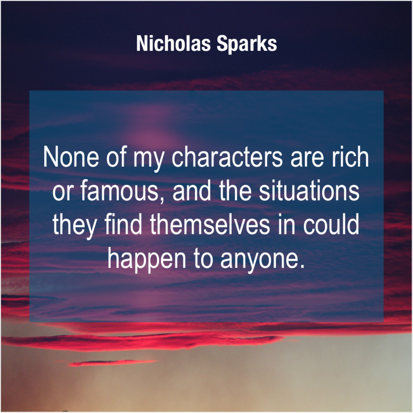 Nicholas Sparks Nicholas Sparks – None of my characters are… February 12, 2019 admin “None of my characters are rich or famous, and the situations they find themselves in could happen to anyone.”-Nicholas Sparks