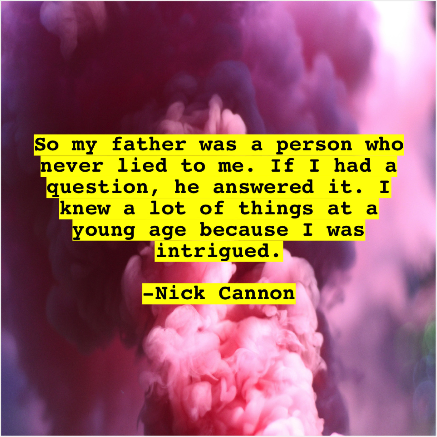 Nick Cannon Nick Cannon – So my father was a… October 5, 2019 admin “So my father was a person who never lied to me. If I had a question, he answered it. I knew a lot of things at a young age because I was intrigued.”-Nick Cannon