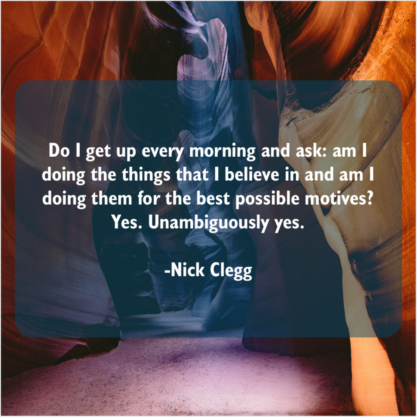 Nick Clegg Nick Clegg – Do I get up every… March 26, 2019 admin “Do I get up every morning and ask: am I doing the things that I believe in and am I doing them for the best possible motives? Yes. Unambiguously yes.”-Nick Clegg