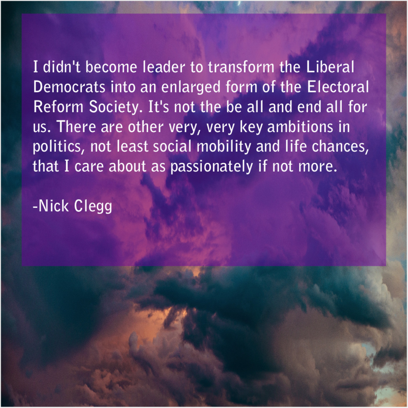 “I didn’t become leader to transform the Liberal Democrats into an enlarged form of the Electoral Reform Society. It’s not the be all and end all for us. There are other very, very key ambitions in politics, not least social mobility and life chances, that I care about as passionately if not more.”