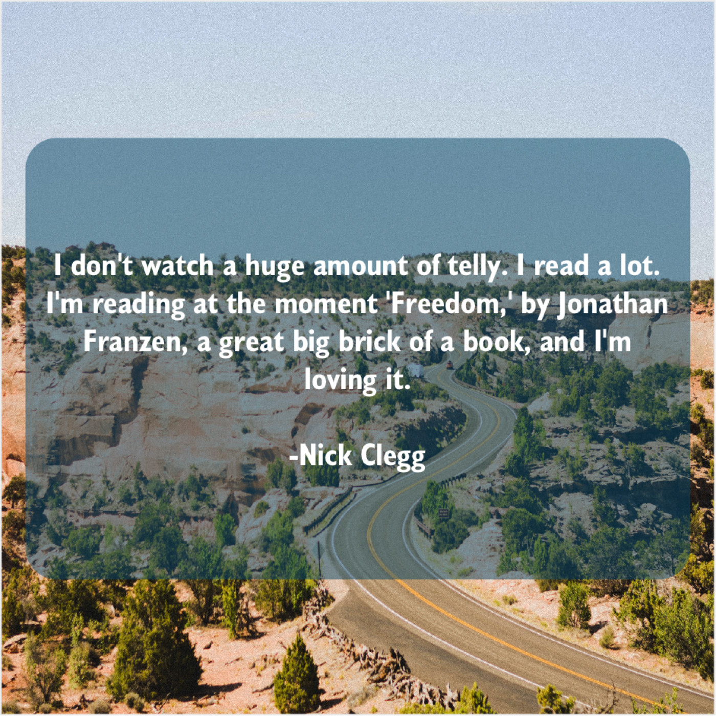 Nick Clegg Nick Clegg – I don’t watch a huge… August 21, 2019 admin “I don’t watch a huge amount of telly. I read a lot. I’m reading at the moment ‘Freedom,’ by Jonathan Franzen, a great big brick of a book, and I’m loving it.”-Nick Clegg
