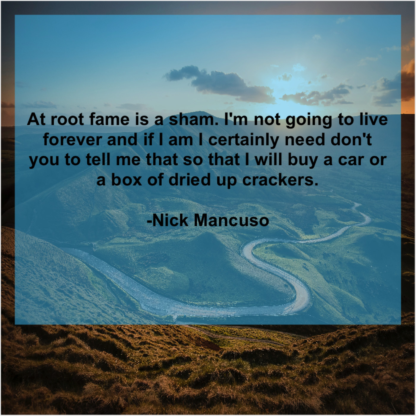 Nick Mancuso Nick Mancuso – At root fame is a… March 25, 2019 admin “At root fame is a sham. I’m not going to live forever and if I am I certainly need don’t you to tell me that so that I will buy a car or a box of dried up crackers.”-Nick Mancuso