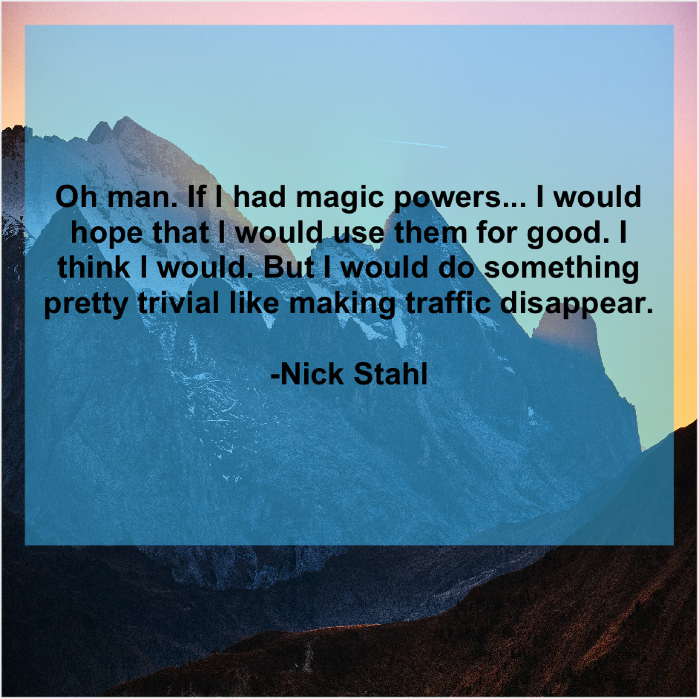 Nick Stahl Nick Stahl – Oh man. If I had… April 8, 2019 admin “Oh man. If I had magic powers… I would hope that I would use them for good. I think I would. But I would do something pretty trivial like making traffic disappear.”-Nick Stahl