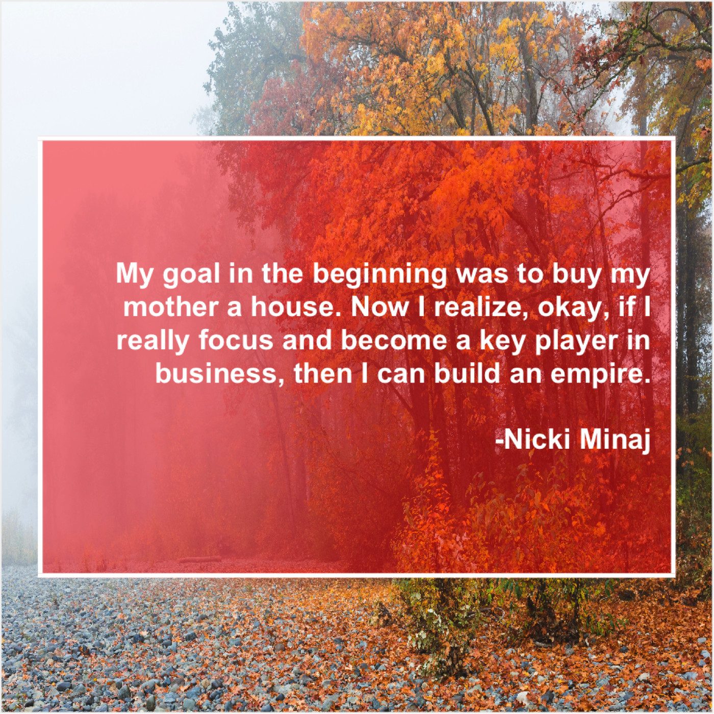 Nicki Minaj Nicki Minaj – My goal in the beginning… August 3, 2019 admin “My goal in the beginning was to buy my mother a house. Now I realize, okay, if I really focus and become a key player in business, then I can build an empire.”-Nicki Minaj