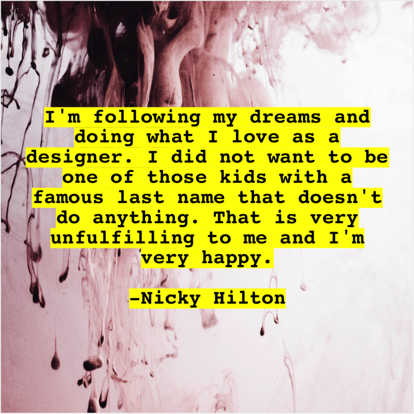 Nicky Hilton Nicky Hilton – I’m following my dreams and… May 9, 2019 admin “I’m following my dreams and doing what I love as a designer. I did not want to be one of those kids with a famous last name that doesn’t do anything. That is very unfulfilling to me and I’m very happy.”-Nicky Hilton