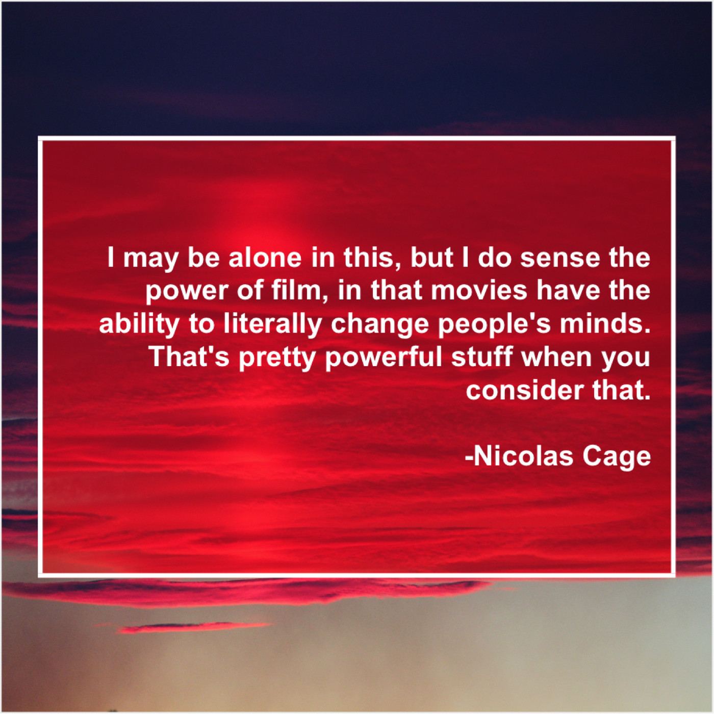 Nicolas Cage Nicolas Cage – I may be alone in… January 23, 2019 admin “I may be alone in this, but I do sense the power of film, in that movies have the ability to literally change people’s minds. That’s pretty powerful stuff when you consider that.”-Nicolas Cage