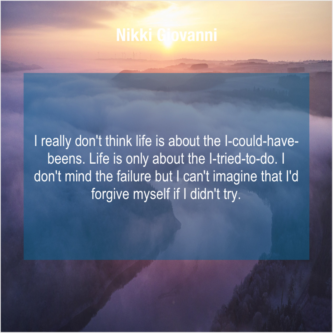 Nikki Giovanni Nikki Giovanni – I really don’t think life… April 25, 2019 admin “I really don’t think life is about the I-could-have-beens. Life is only about the I-tried-to-do. I don’t mind the failure but I can’t imagine that I’d forgive myself if I didn’t try.”-Nikki Giovanni