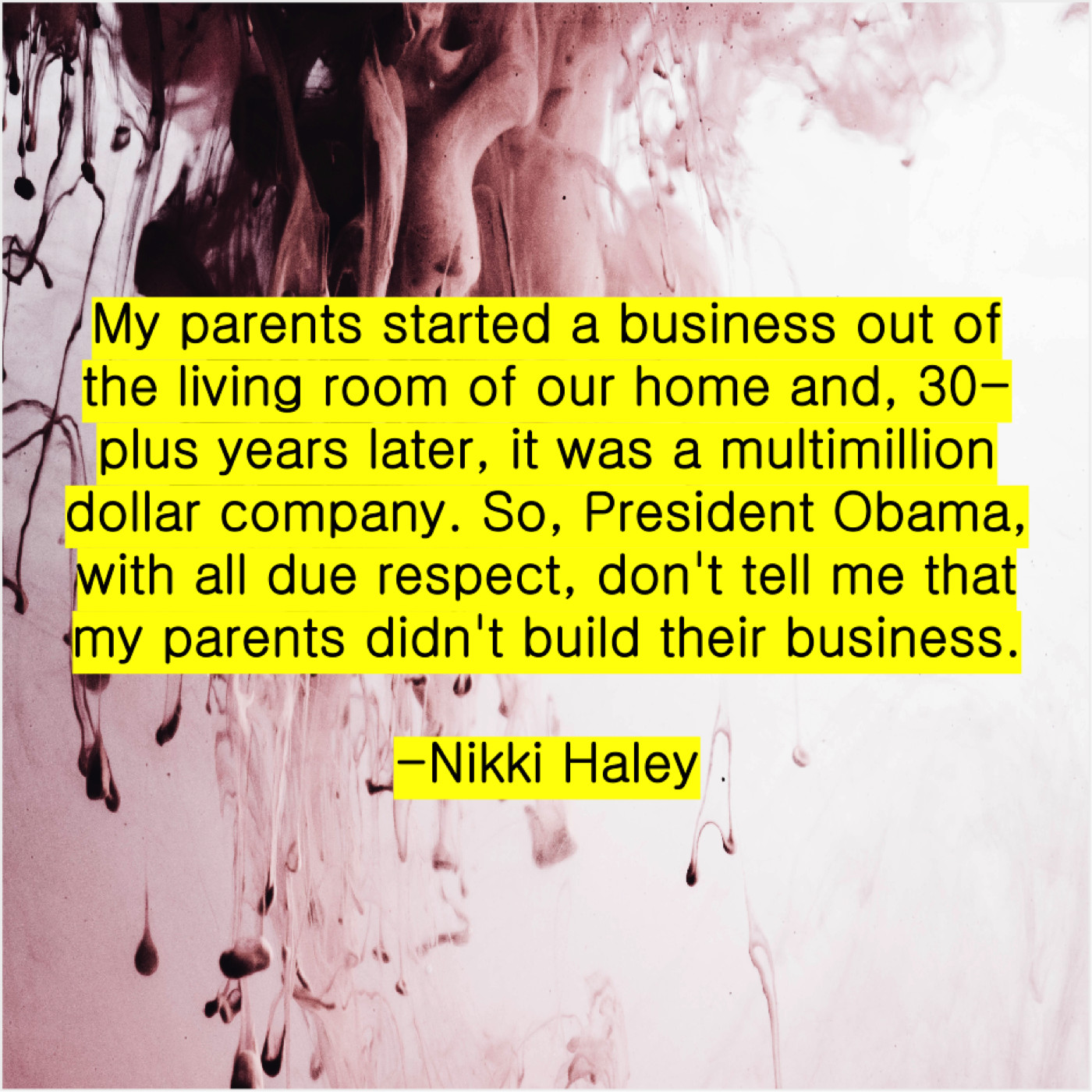 Nikki Haley Nikki Haley – My parents started a business… March 31, 2019 admin “My parents started a business out of the living room of our home and, 30-plus years later, it was a multimillion dollar company. So, President Obama, with all due respect, don’t tell me that my parents didn’t build their business.”-Nikki Haley