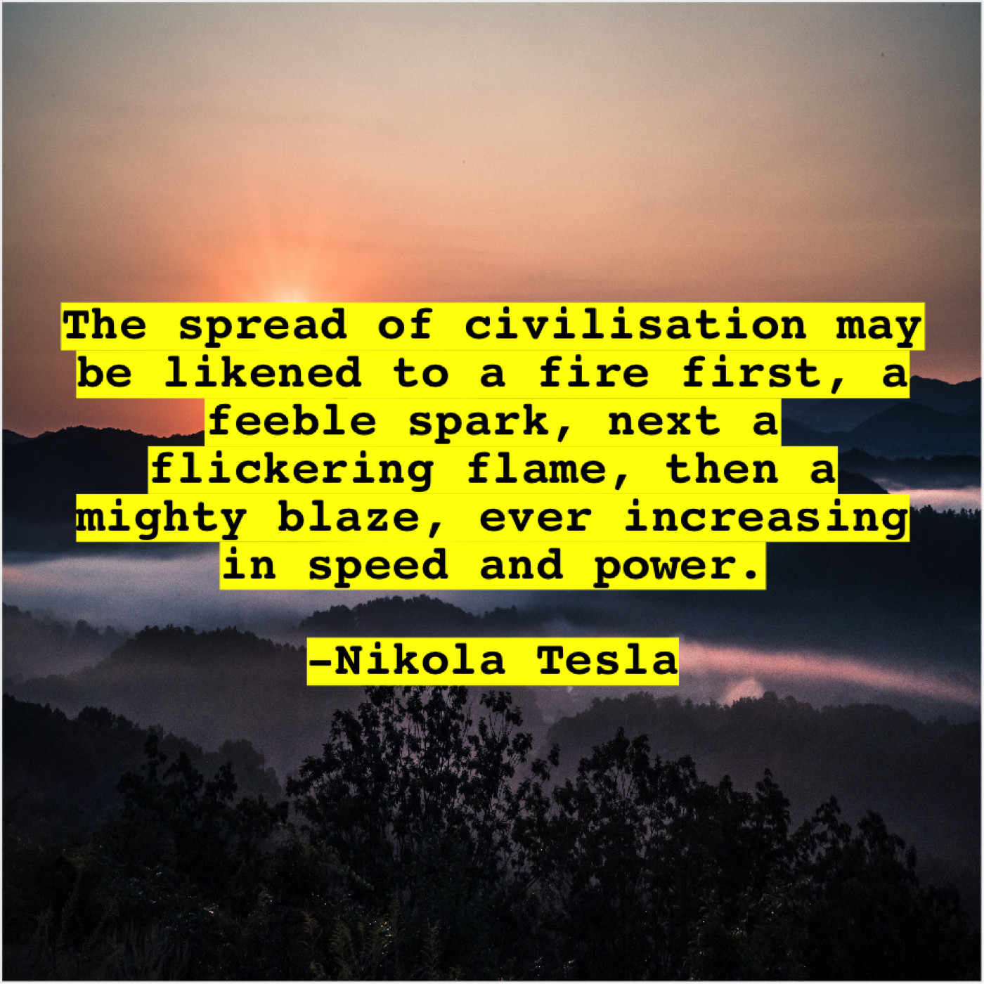 Nikola Tesla Nikola Tesla – The spread of civilisation may… September 6, 2019 admin “The spread of civilisation may be likened to a fire first, a feeble spark, next a flickering flame, then a mighty blaze, ever increasing in speed and power.”-Nikola Tesla