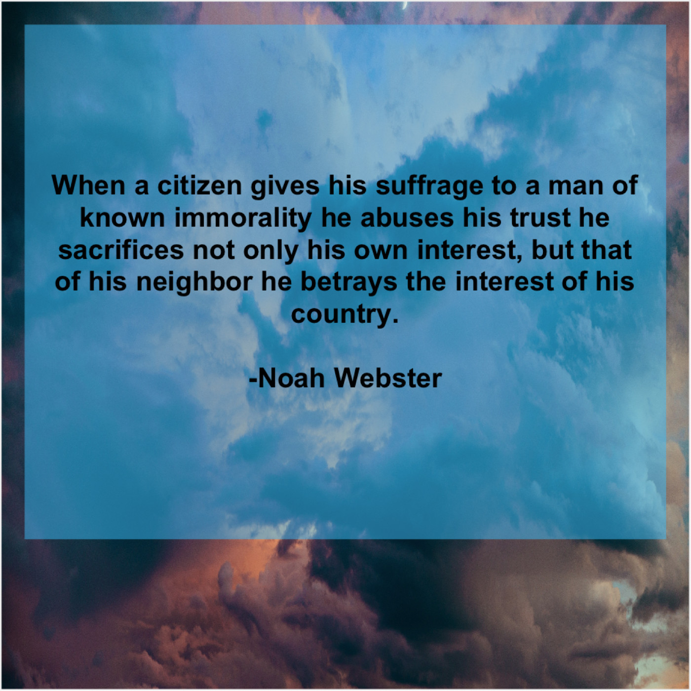 Noah Webster Noah Webster – When a citizen gives his… July 14, 2019 admin “When a citizen gives his suffrage to a man of known immorality he abuses his trust he sacrifices not only his own interest, but that of his neighbor he betrays the interest of his country.”-Noah Webster