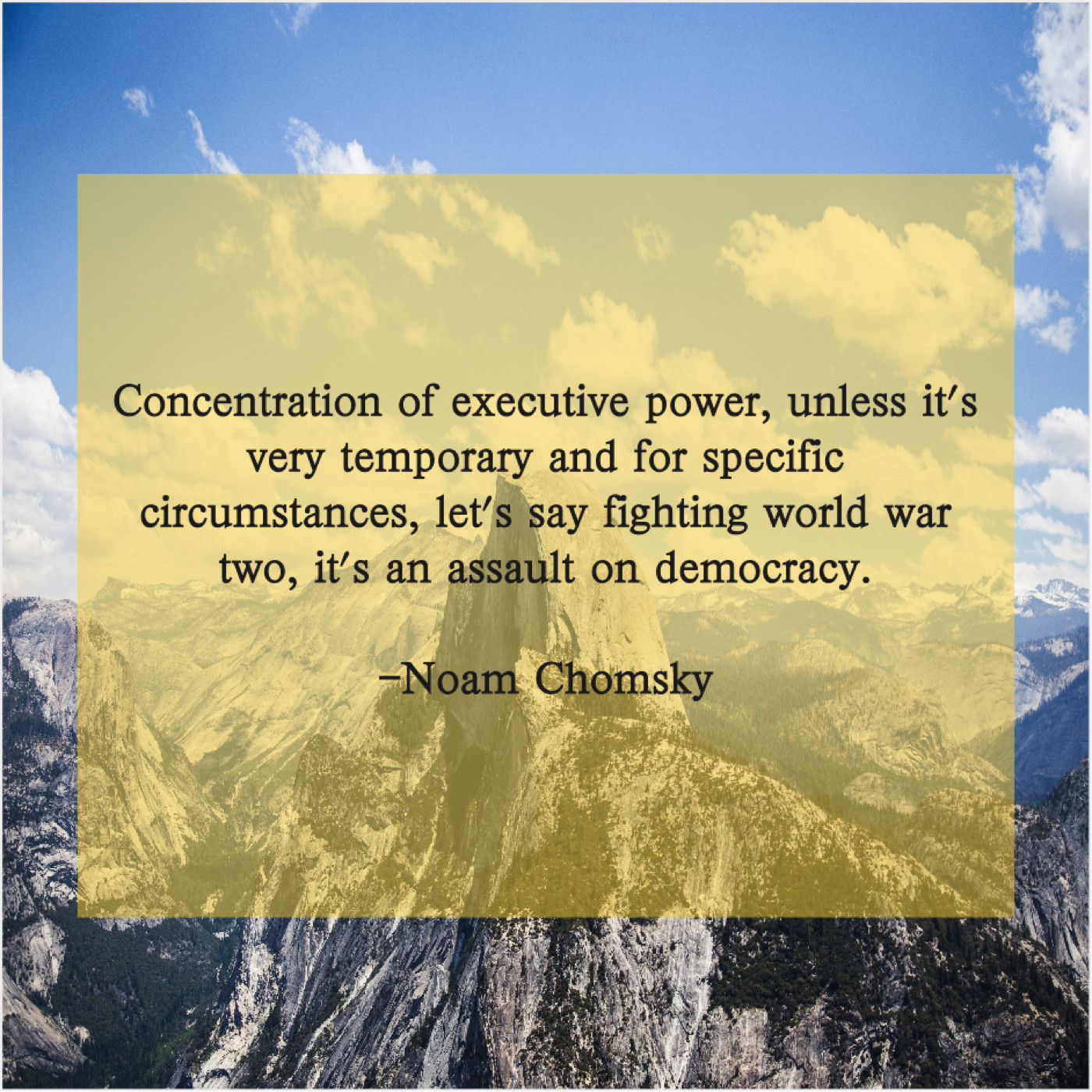 Noam Chomsky Noam Chomsky – Concentration of executive power, unless… October 22, 2019 admin “Concentration of executive power, unless it’s very temporary and for specific circumstances, let’s say fighting world war two, it’s an assault on democracy.”-Noam Chomsky