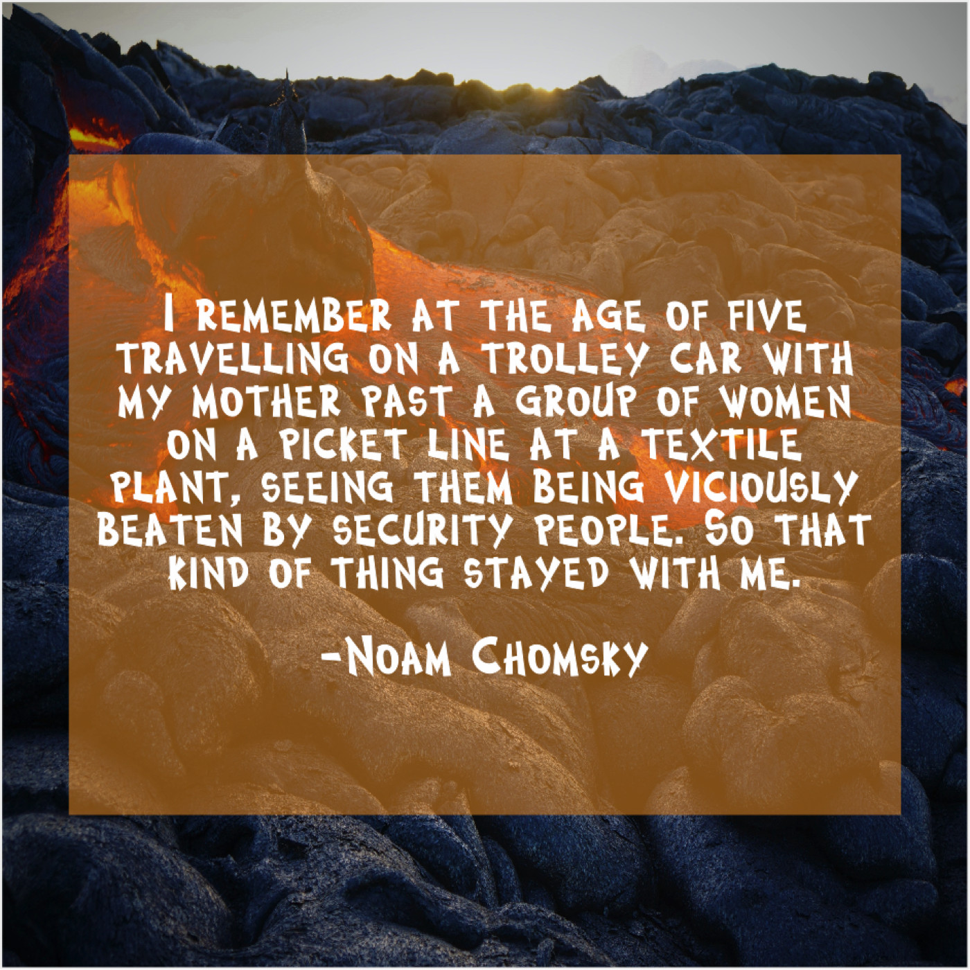 Noam Chomsky Noam Chomsky – I remember at the age… October 13, 2019 admin “I remember at the age of five travelling on a trolley car with my mother past a group of women on a picket line at a textile plant, seeing them being viciously beaten by security people. So that kind of thing stayed with me.”-Noam Chomsky