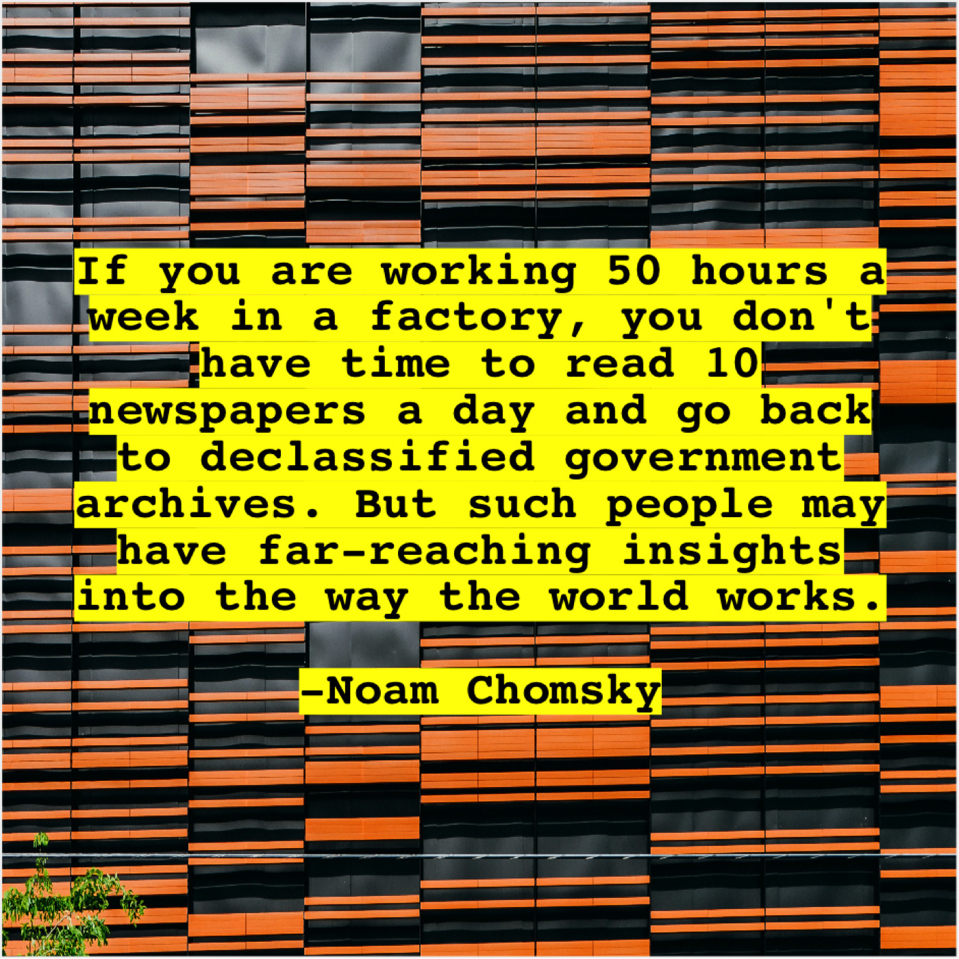 Noam Chomsky Noam Chomsky – If you are working 50… February 12, 2019 admin “If you are working 50 hours a week in a factory, you don’t have time to read 10 newspapers a day and go back to declassified government archives. But such people may have far-reaching insights into the way the world works.”-Noam Chomsky