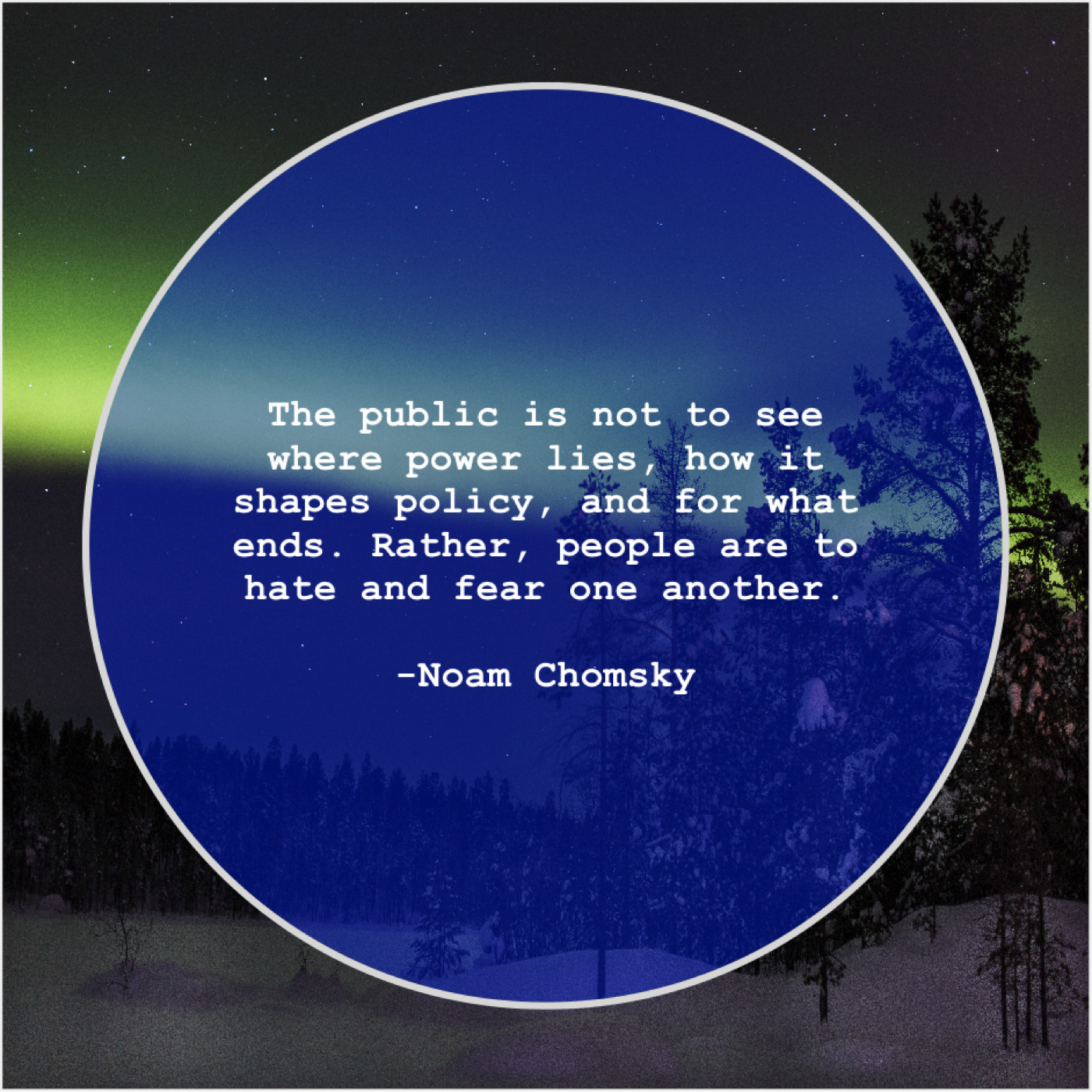 Noam Chomsky Noam Chomsky – The public is not to… March 27, 2019 admin “The public is not to see where power lies, how it shapes policy, and for what ends. Rather, people are to hate and fear one another.”-Noam Chomsky