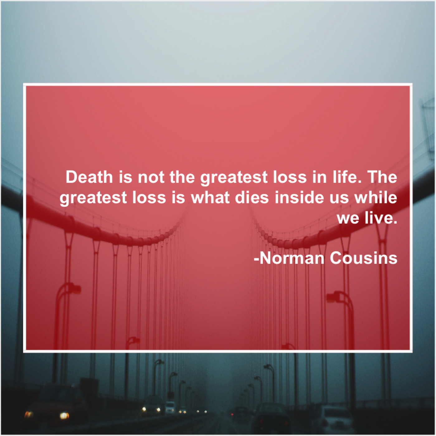 Norman Cousins Norman Cousins – Death is not the greatest… January 9, 2019 admin “Death is not the greatest loss in life. The greatest loss is what dies inside us while we live.”-Norman Cousins