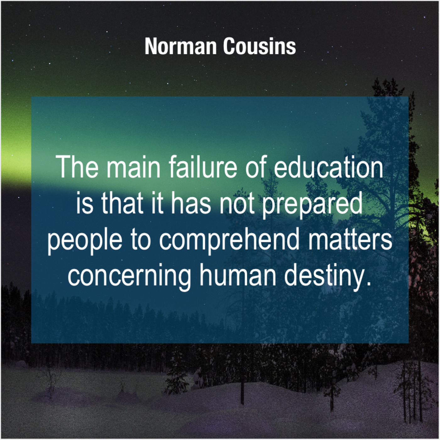 Norman Cousins Norman Cousins – The main failure of education… September 21, 2019 admin “The main failure of education is that it has not prepared people to comprehend matters concerning human destiny.”-Norman Cousins