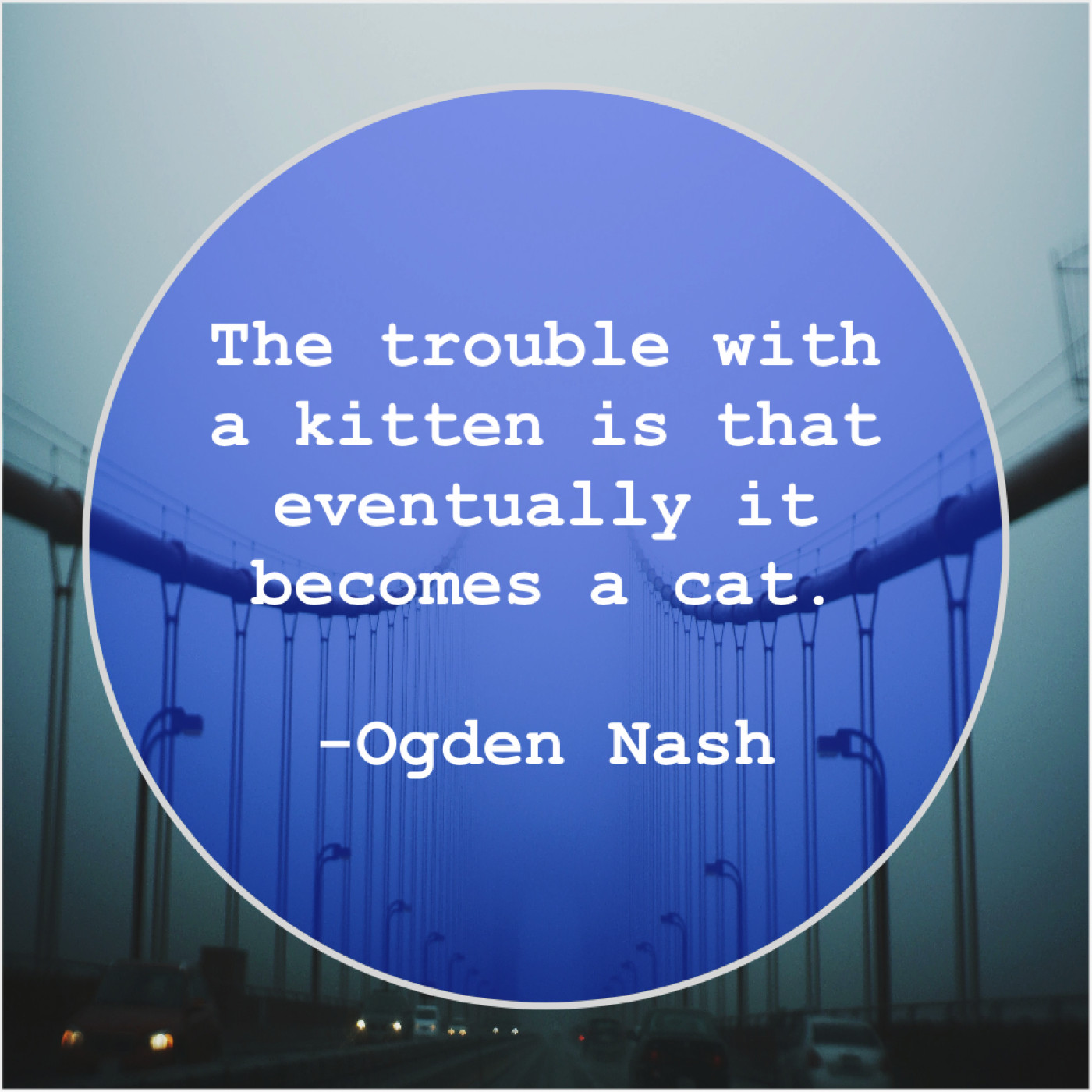 Ogden Nash Ogden Nash – The trouble with a kitten… October 7, 2019 admin “The trouble with a kitten is that eventually it becomes a cat.”-Ogden Nash