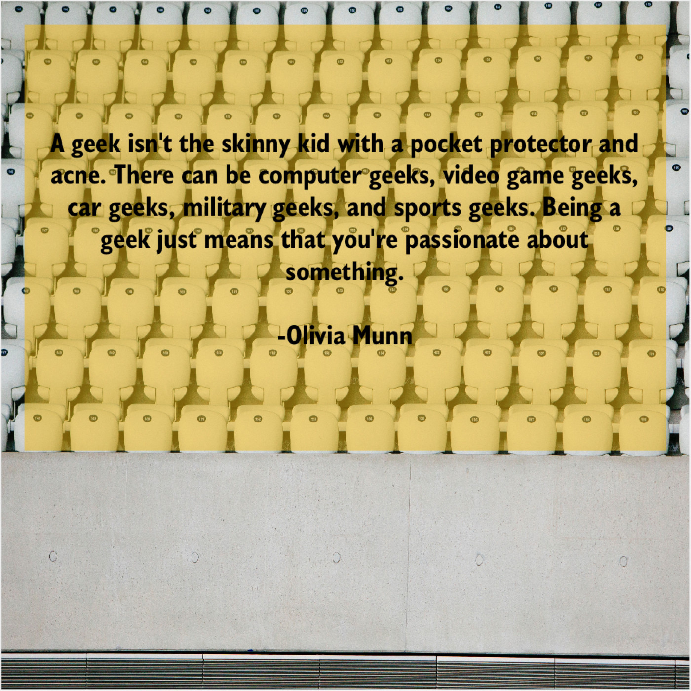 Olivia Munn Olivia Munn – A geek isn’t the skinny… August 12, 2019 admin “A geek isn’t the skinny kid with a pocket protector and acne. There can be computer geeks, video game geeks, car geeks, military geeks, and sports geeks. Being a geek just means that you’re passionate about something.”-Olivia Munn