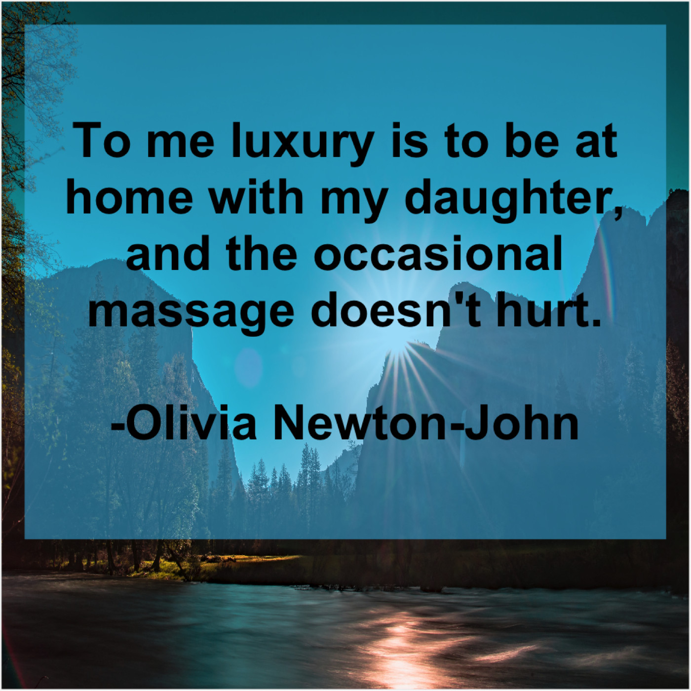Olivia Newton-John Olivia Newton-John – To me luxury is to… March 21, 2019 admin “To me luxury is to be at home with my daughter, and the occasional massage doesn’t hurt.”-Olivia Newton-John