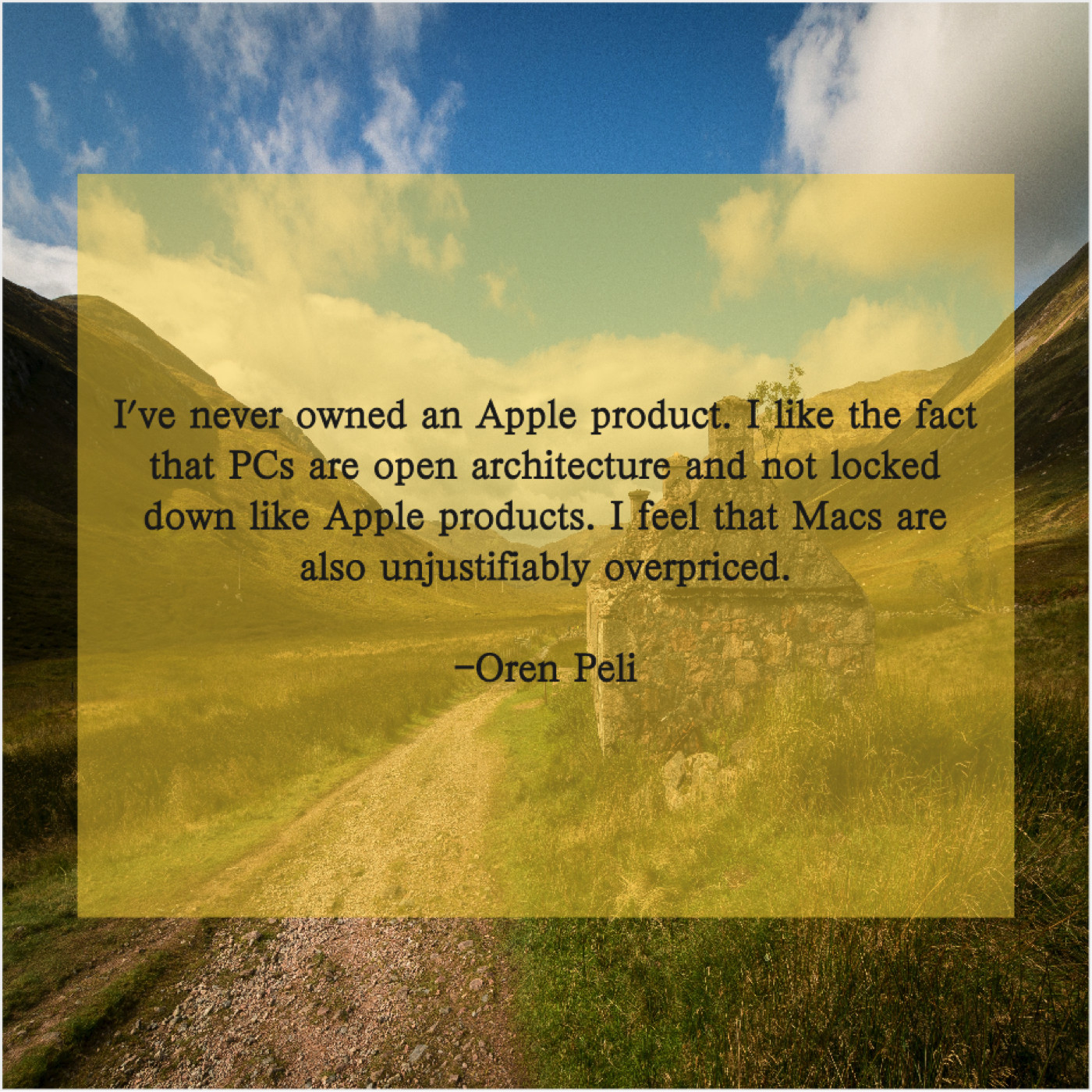 Oren Peli Oren Peli – I’ve never owned an Apple… January 10, 2019 admin “I’ve never owned an Apple product. I like the fact that PCs are open architecture and not locked down like Apple products. I feel that Macs are also unjustifiably overpriced.”-Oren Peli