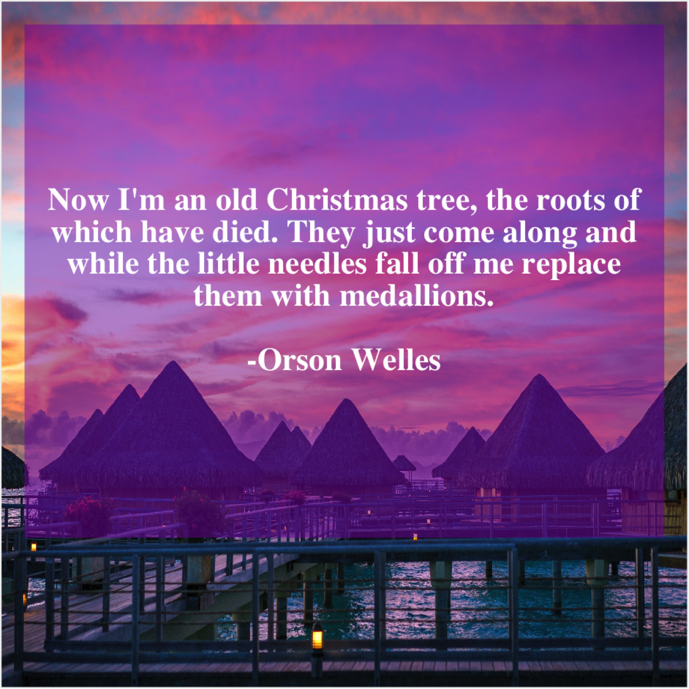 Orson Welles Orson Welles – Now I’m an old Christmas… May 20, 2019 admin “Now I’m an old Christmas tree, the roots of which have died. They just come along and while the little needles fall off me replace them with medallions.”-Orson Welles