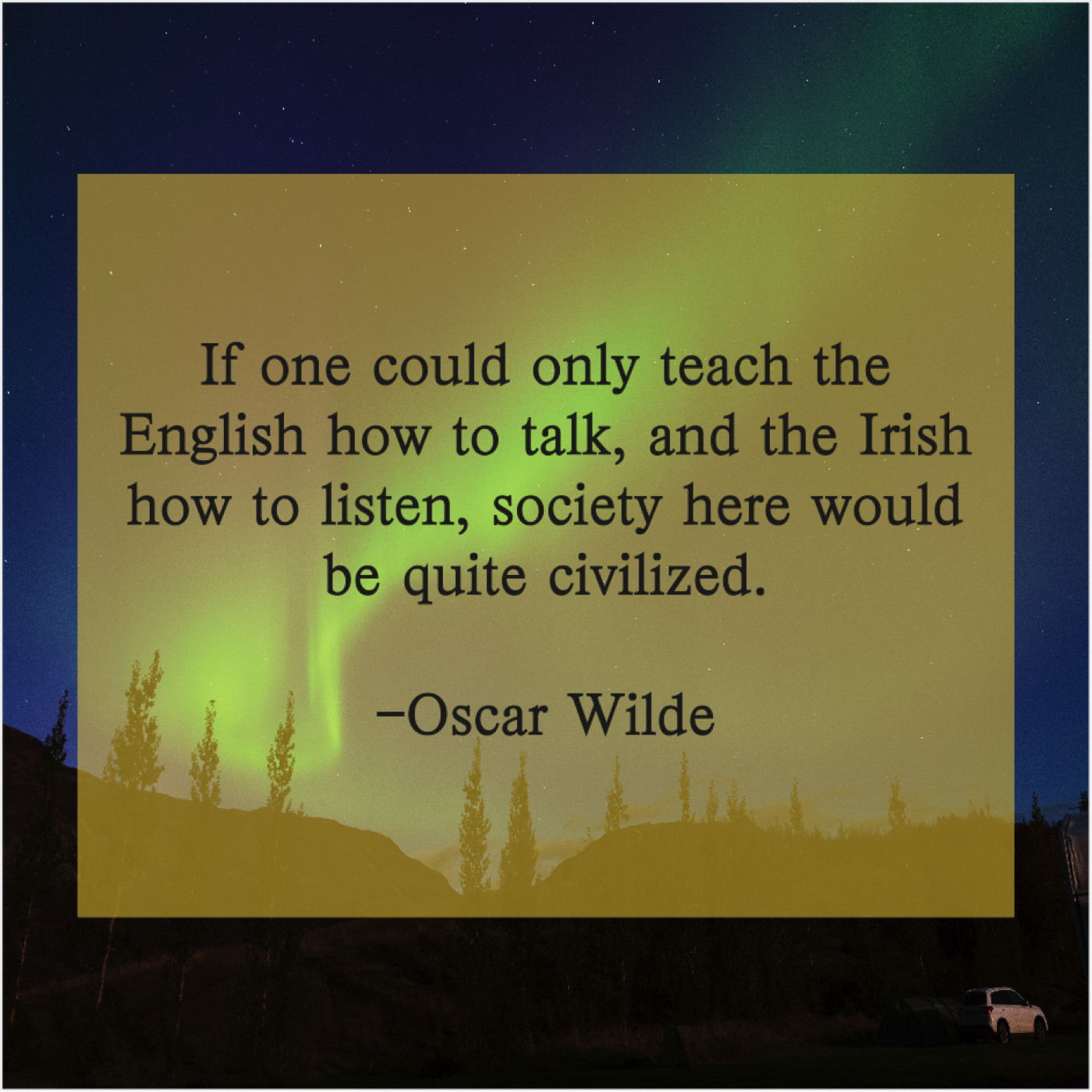 Oscar Wilde Oscar Wilde – If one could only teach… August 14, 2019 admin “If one could only teach the English how to talk, and the Irish how to listen, society here would be quite civilized.”-Oscar Wilde