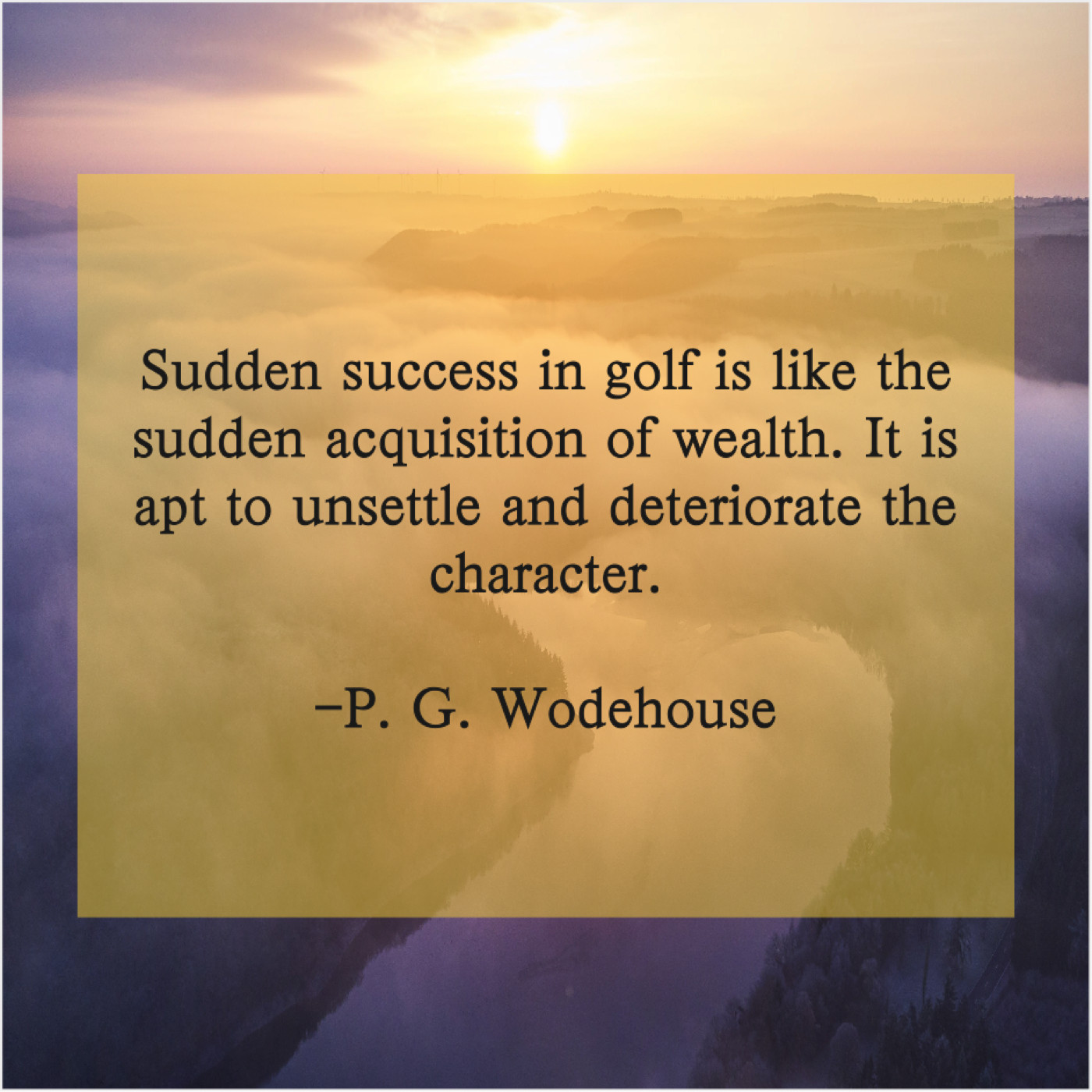 P. G. Wodehouse P. G. Wodehouse – Sudden success in golf is… April 30, 2019 admin “Sudden success in golf is like the sudden acquisition of wealth. It is apt to unsettle and deteriorate the character.”-P. G. Wodehouse