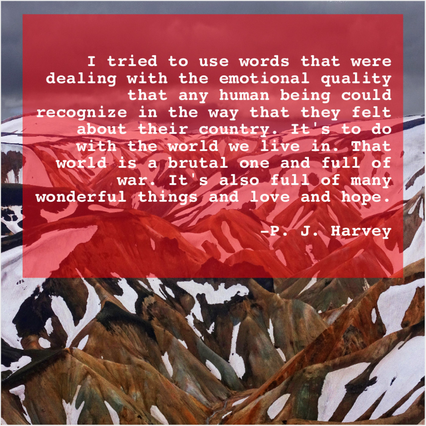 “I tried to use words that were dealing with the emotional quality that any human being could recognize in the way that they felt about their country. It’s to do with the world we live in. That world is a brutal one and full of war. It’s also full of many wonderful things and love and hope.”