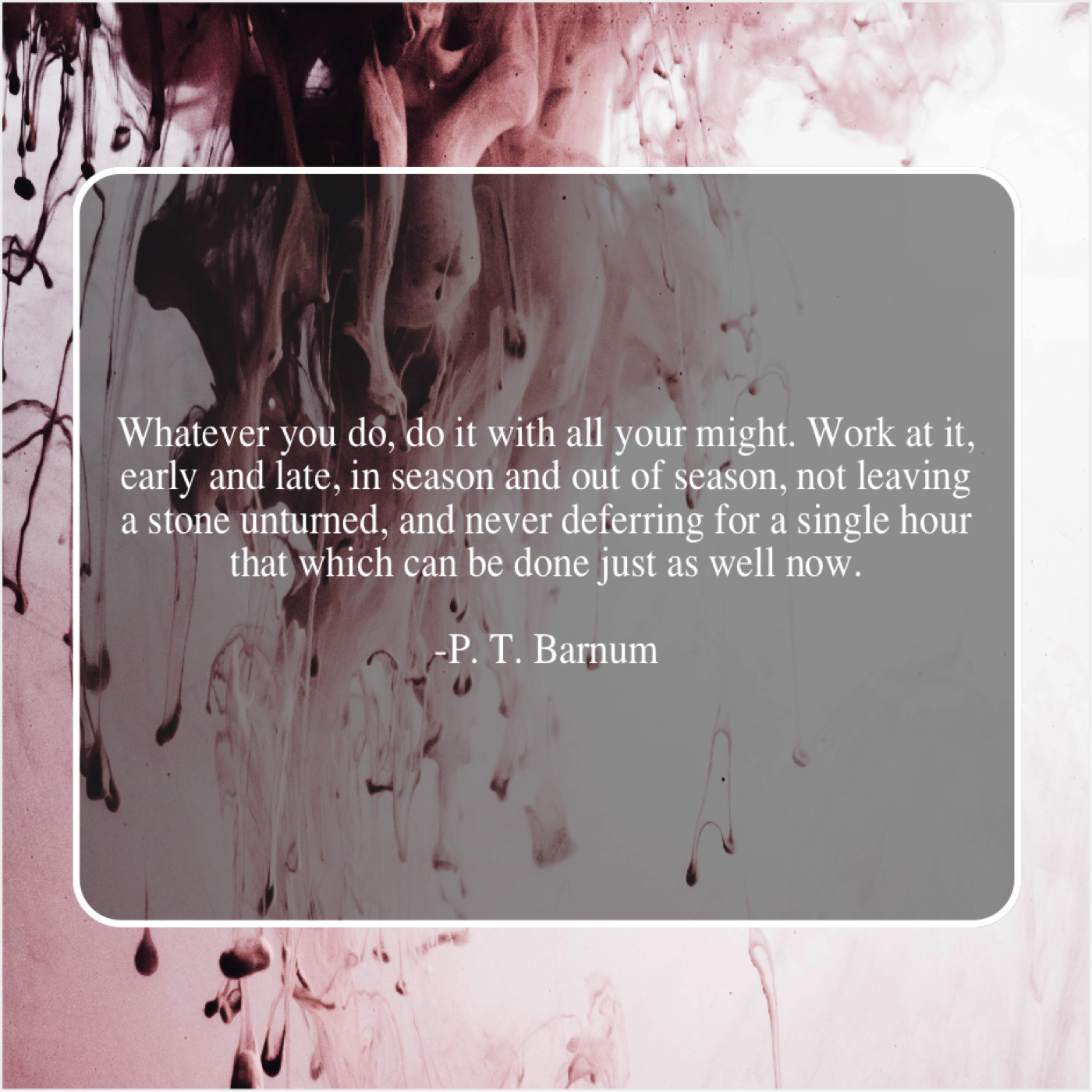P. T. Barnum P. T. Barnum – Whatever you do, do it… June 26, 2019 admin “Whatever you do, do it with all your might. Work at it, early and late, in season and out of season, not leaving a stone unturned, and never deferring for a single hour that which can be done just as well now.”-P. T. Barnum