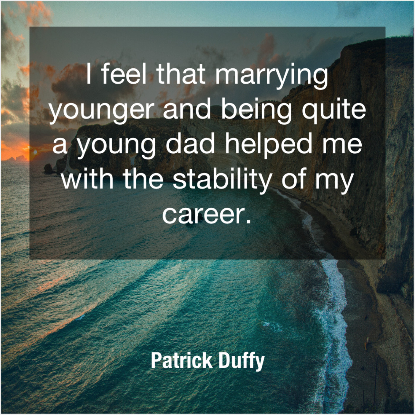 Patrick Duffy Patrick Duffy – I feel that marrying younger… February 9, 2019 admin “I feel that marrying younger and being quite a young dad helped me with the stability of my career.”-Patrick Duffy