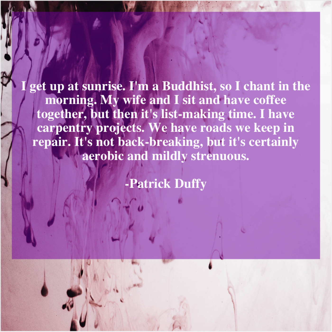 “I get up at sunrise. I’m a Buddhist, so I chant in the morning. My wife and I sit and have coffee together, but then it’s list-making time. I have carpentry projects. We have roads we keep in repair. It’s not back-breaking, but it’s certainly aerobic and mildly strenuous.”
