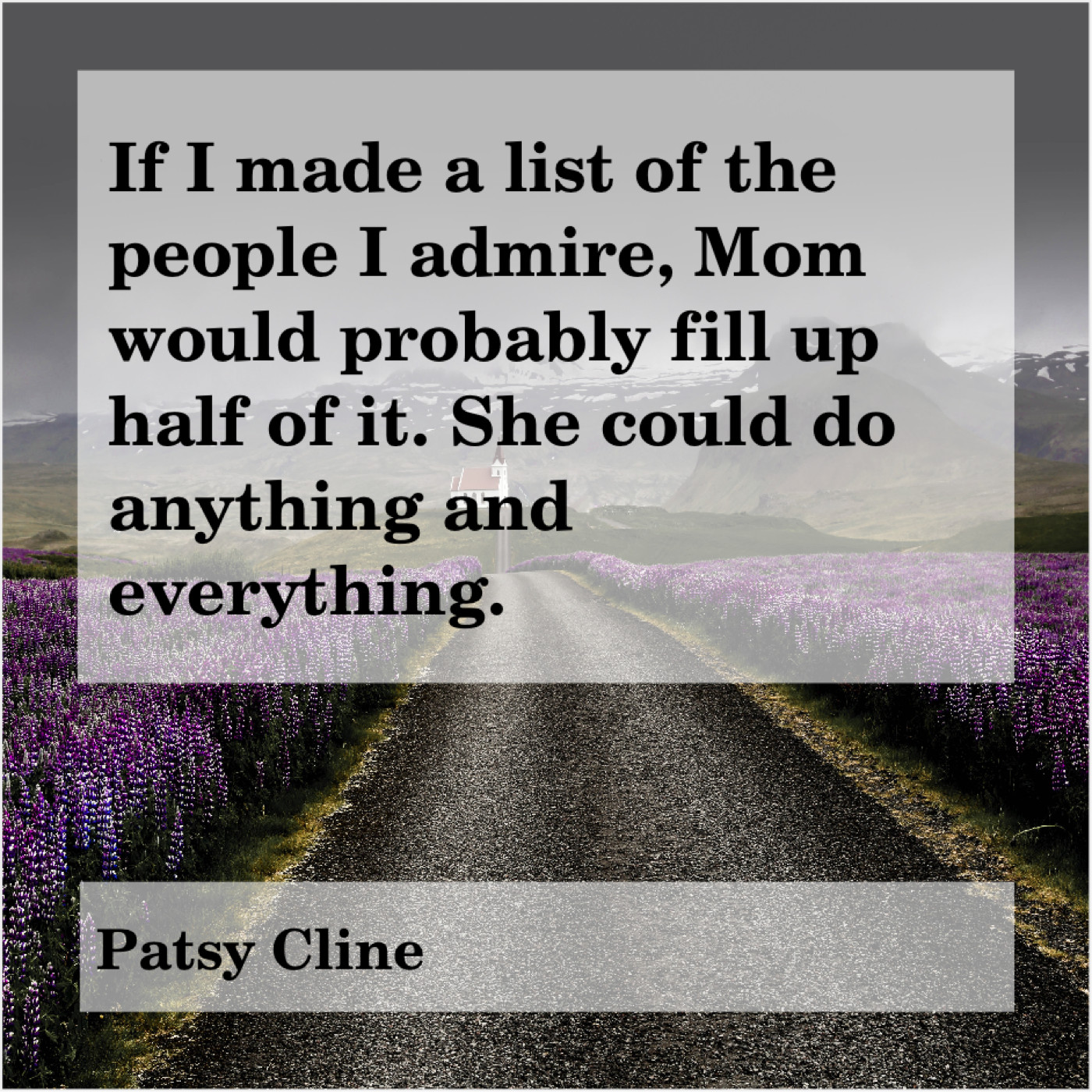 Patsy Cline Patsy Cline – If I made a list… January 27, 2019 admin “If I made a list of the people I admire, Mom would probably fill up half of it. She could do anything and everything.”-Patsy Cline