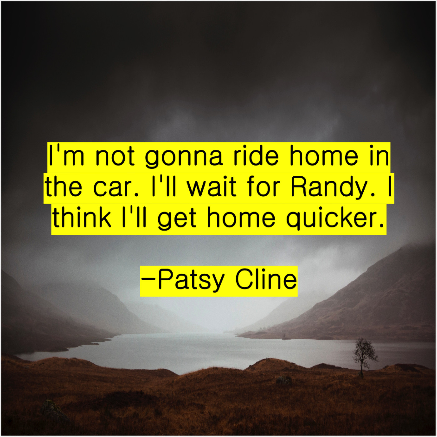 Patsy Cline Patsy Cline – I’m not gonna ride home… August 3, 2019 admin “I’m not gonna ride home in the car. I’ll wait for Randy. I think I’ll get home quicker.”-Patsy Cline