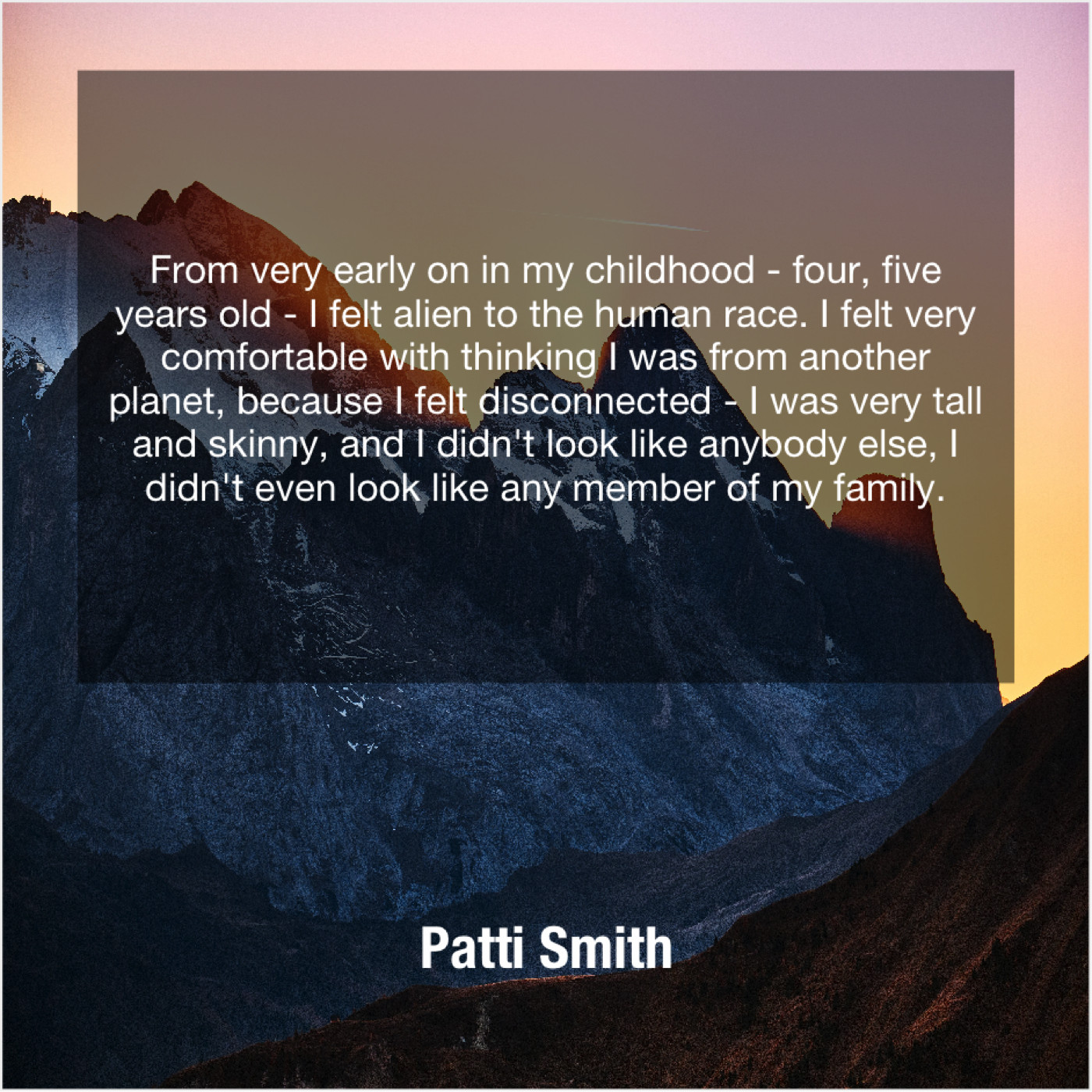 “From very early on in my childhood – four, five years old – I felt alien to the human race. I felt very comfortable with thinking I was from another planet, because I felt disconnected – I was very tall and skinny, and I didn’t look like anybody else, I didn’t even look like any member of my family.”