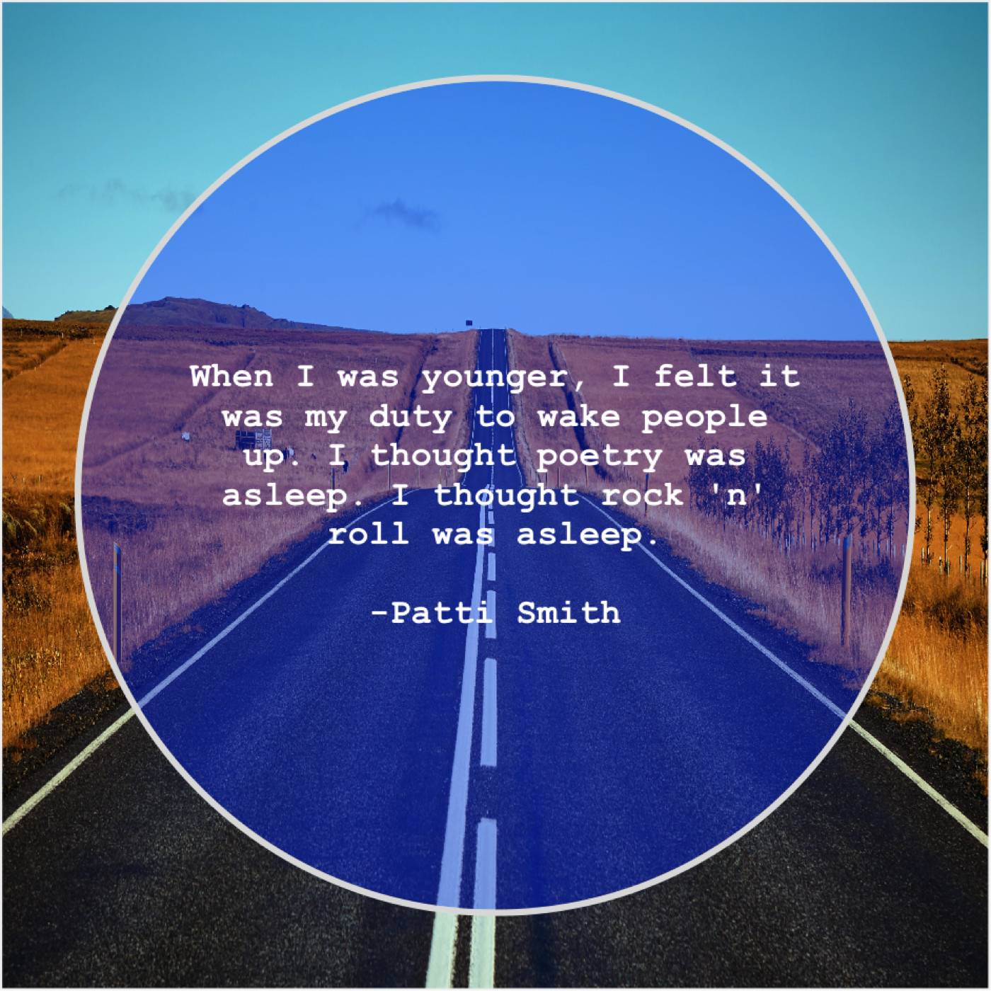 Patti Smith Patti Smith – When I was younger, I… February 6, 2019 admin “When I was younger, I felt it was my duty to wake people up. I thought poetry was asleep. I thought rock ‘n’ roll was asleep.”-Patti Smith