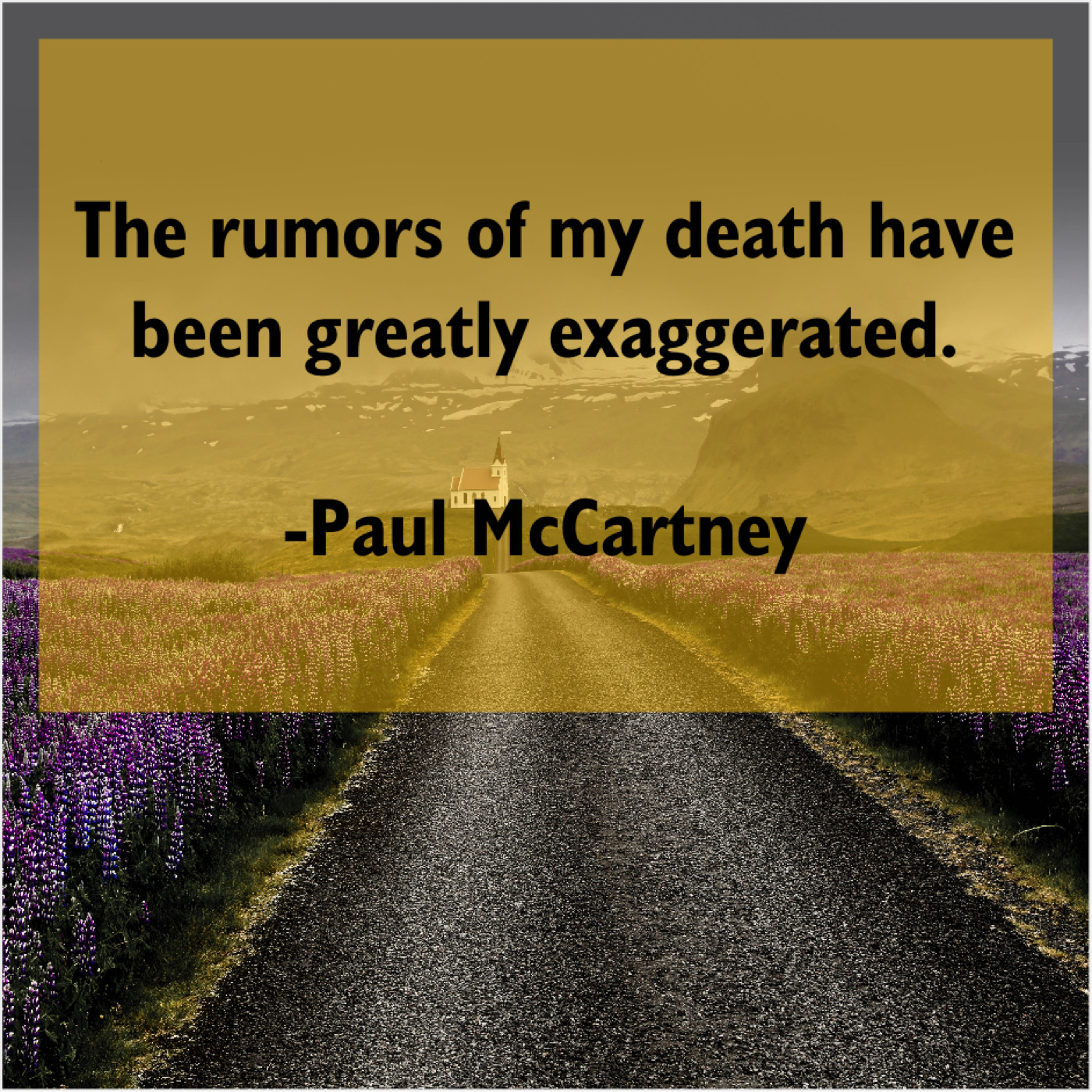 Paul McCartney Paul McCartney – The rumors of my death… October 20, 2019 admin “The rumors of my death have been greatly exaggerated.”-Paul McCartney