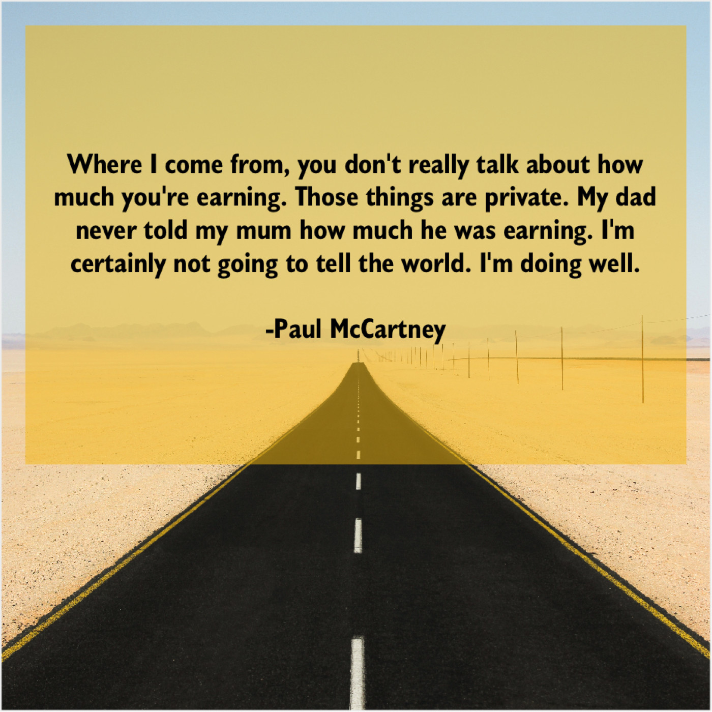 Paul McCartney Paul McCartney – Where I come from, you… June 17, 2019 admin “Where I come from, you don’t really talk about how much you’re earning. Those things are private. My dad never told my mum how much he was earning. I’m certainly not going to tell the world. I’m doing well.”-Paul McCartney