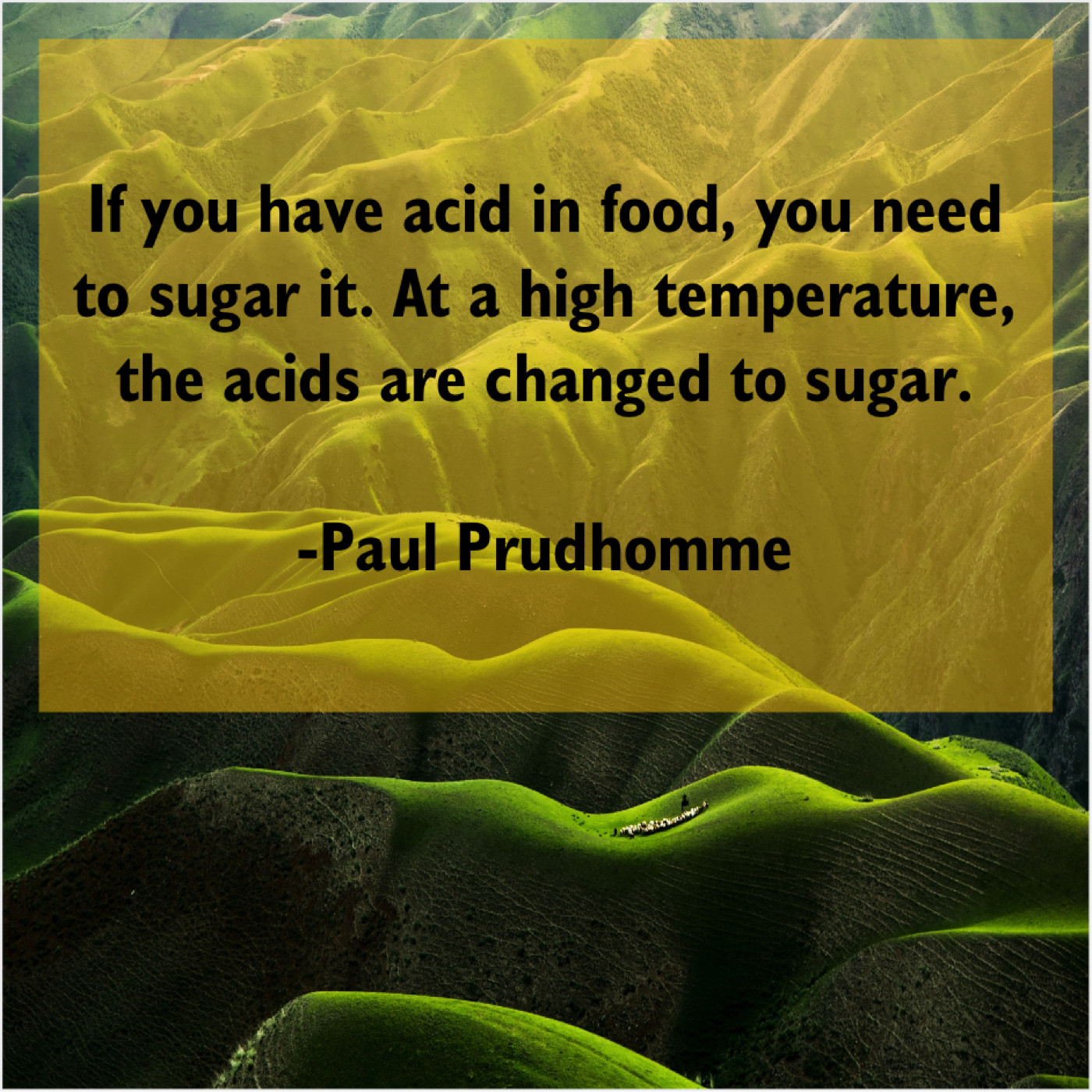 Paul Prudhomme Paul Prudhomme – If you have acid in… August 8, 2019 admin “If you have acid in food, you need to sugar it. At a high temperature, the acids are changed to sugar.”-Paul Prudhomme