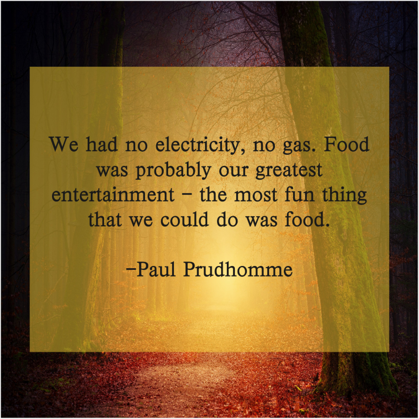 Paul Prudhomme Paul Prudhomme – We had no electricity, no… July 9, 2019 admin “We had no electricity, no gas. Food was probably our greatest entertainment – the most fun thing that we could do was food.”-Paul Prudhomme