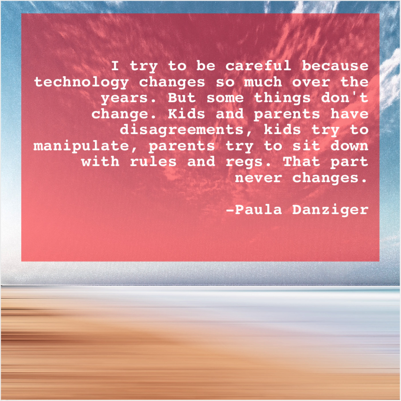 Paula Danziger Paula Danziger – I try to be careful… July 4, 2019 admin “I try to be careful because technology changes so much over the years. But some things don’t change. Kids and parents have disagreements, kids try to manipulate, parents try to sit down with rules and regs. That part never changes.”-Paula Danziger